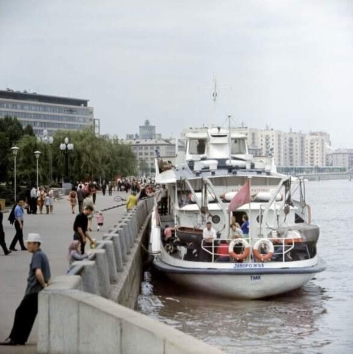 Пассажиры расположились по всей длине судна, а некоторые из них наблюдают за движением набережной и близлежащих улиц. Это визуально подтверждает активное использование Днепра как транспортной и рекреационной зоны уже тогда в далекие семидесятые.