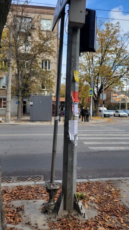 Как видно на фото, конструкцию прикрепили к столбу со светофором с помощью проводов.
