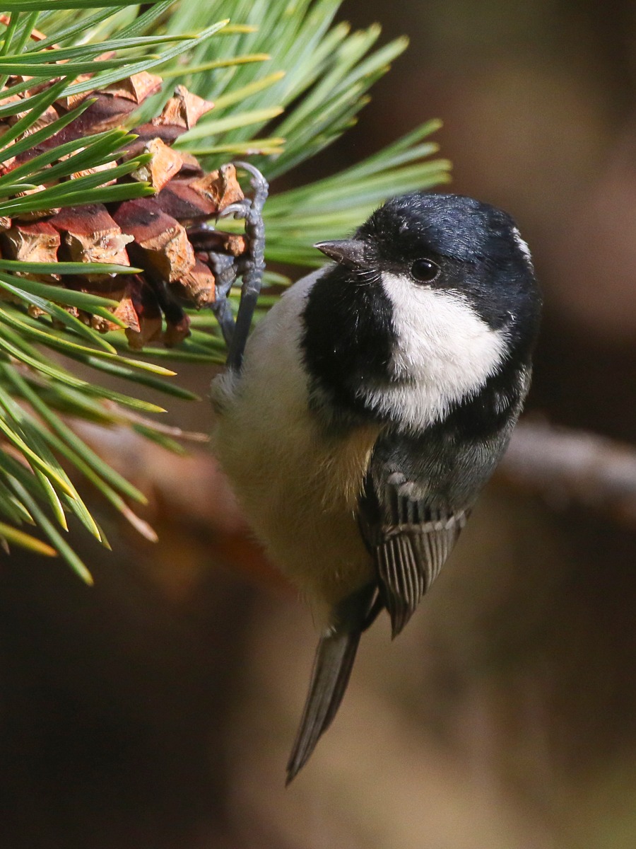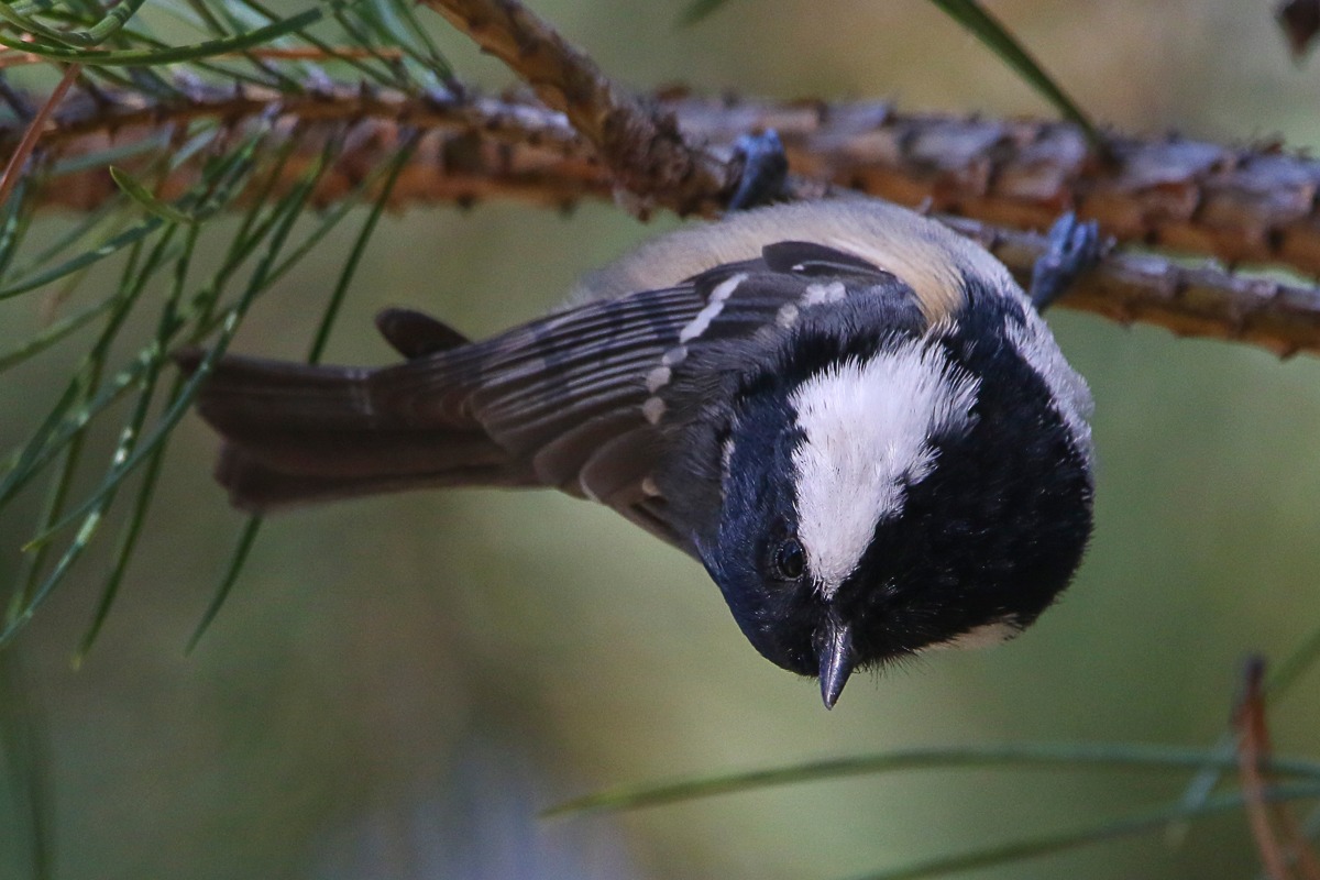 Осенью и зимой черная синица употребляет в пищу семена растений, преимущественно хвойных и особенно ели. В этот период часто можно наблюдать птиц, свисающих из еловых шишек и достающих изнутри семян. Это и удалось зафиксировать Юрию Мухину.