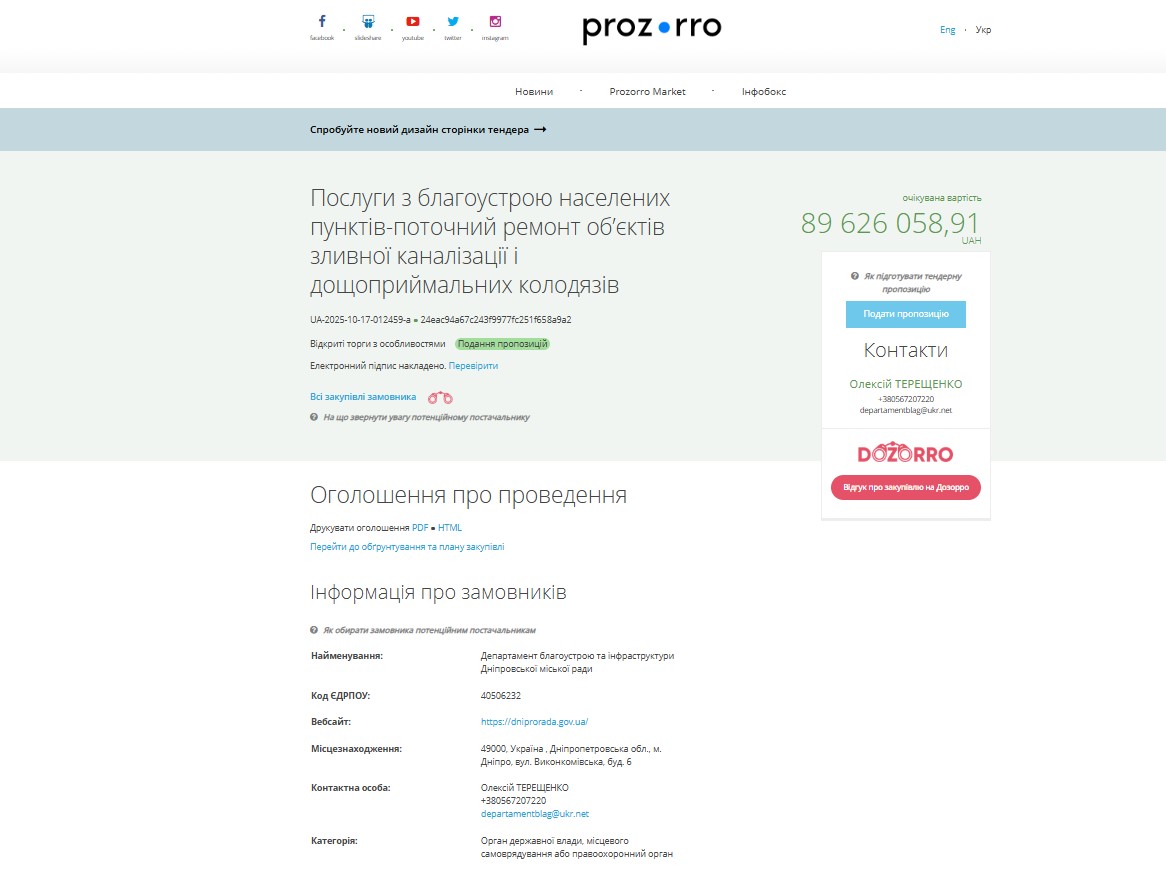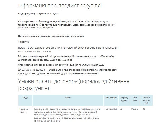 В системе публичных закупок "Prozorro" появилось объявление от департамента благоустройства и инфраструктуры Днепровского горсовета о проведении тендера на капитальный ремонт ливневой канализации. Стоимость контракта — 89 миллионов гривен. Об этом сообщает "Відомо".