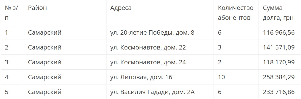 С 27 по 31 октября 2025 года в многоквартирных домах Самарского района проводятся работы по прекращению предоставления услуг абонентам, которые длительное время не платили за воду. По информации "Днепроводоканала”, задолженность жителей по этим адресам составляет 868 809,79 грн.