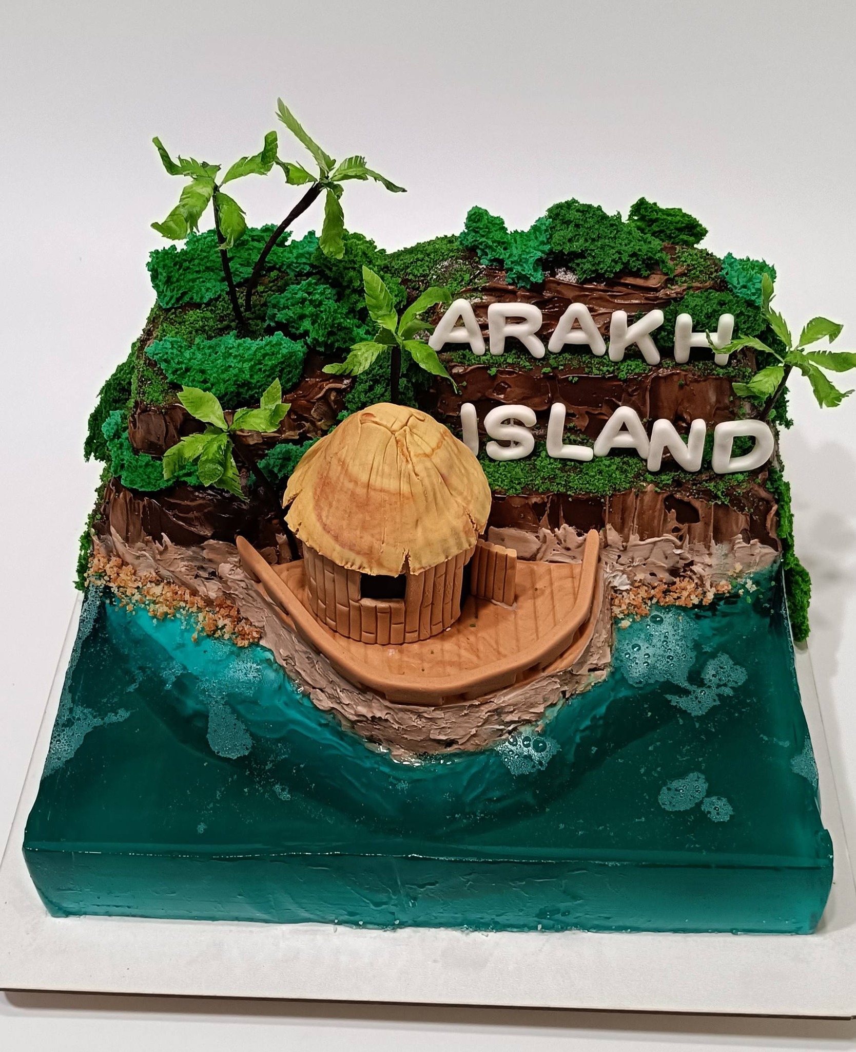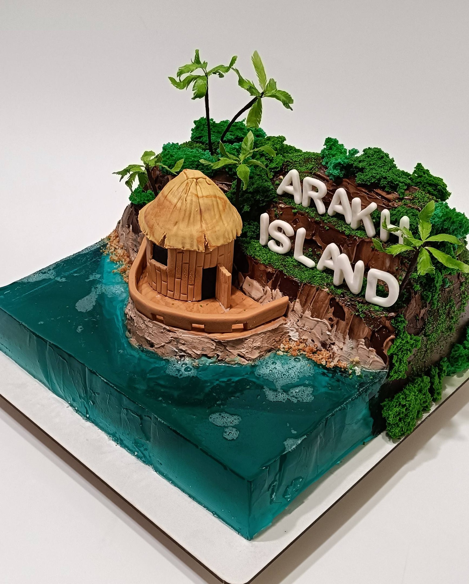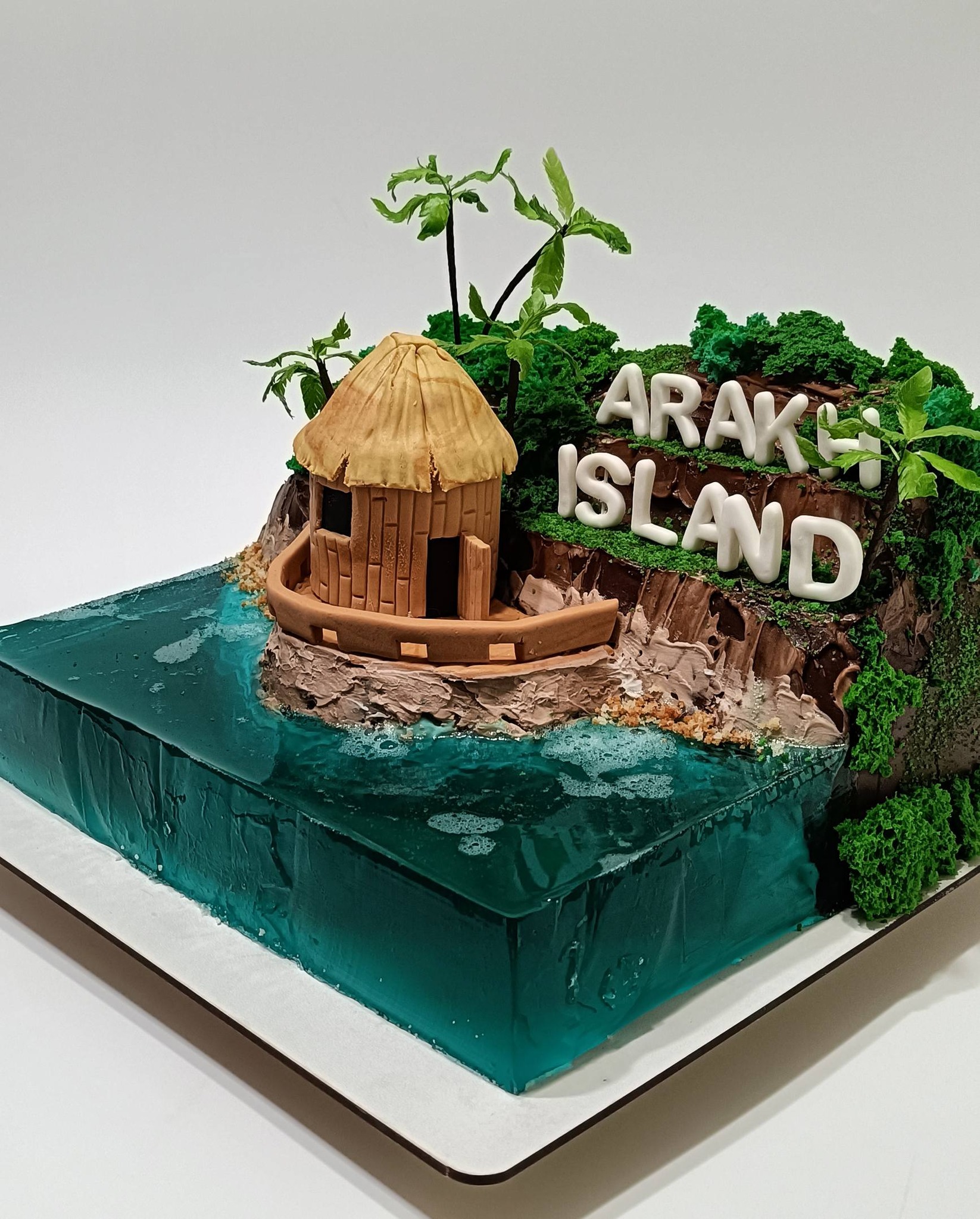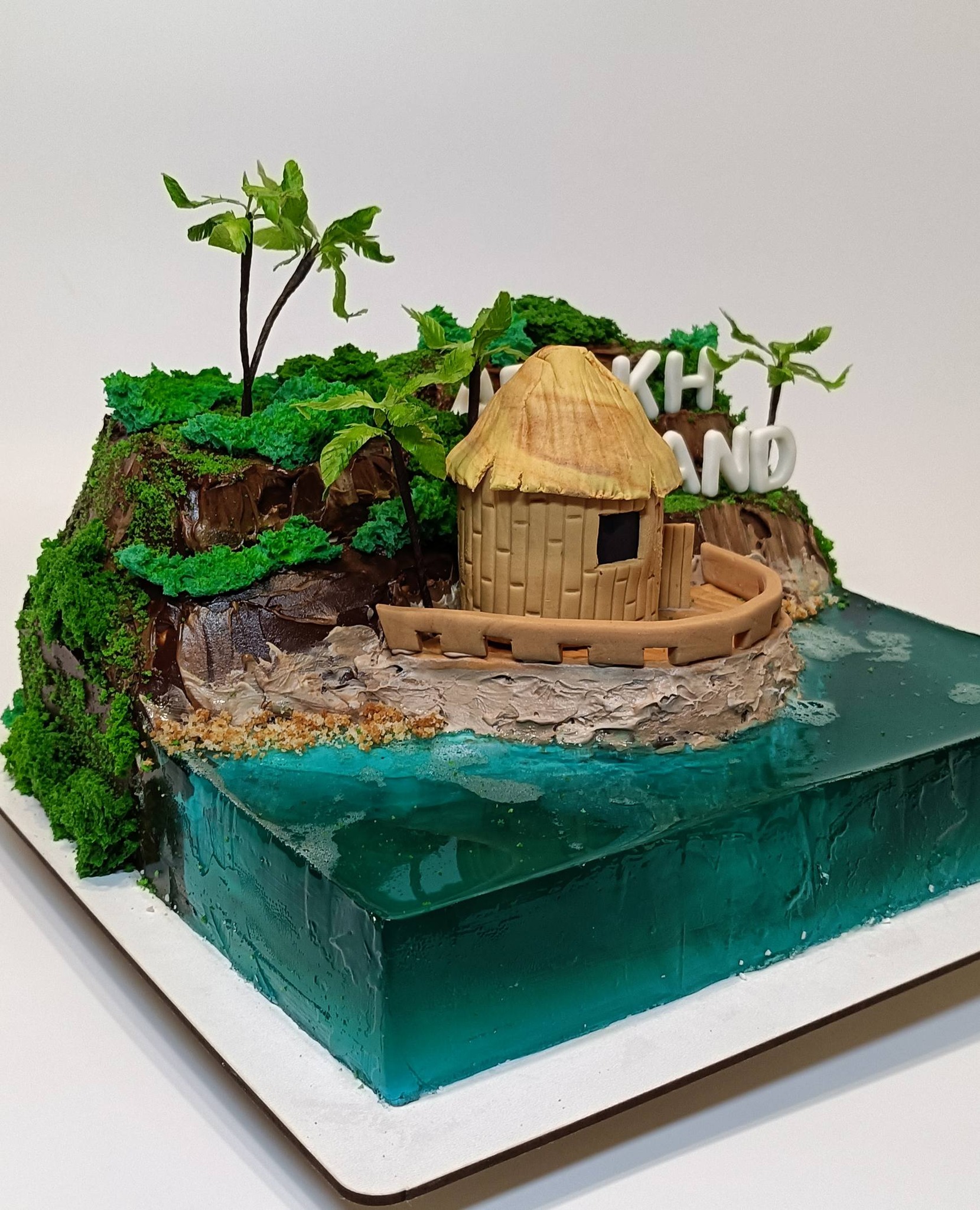Кондитер изготовил эффектный десерт в виде острова, уютно расположившегося среди ярко-голубых океанических вод. На нем – только маленький домик, напоминающий бунгало.