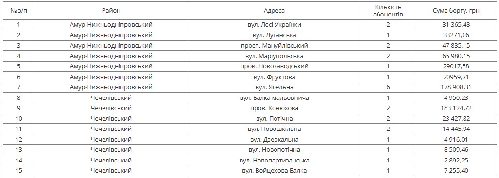 Кроме того, с 6 по 17 апреля будут проводиться запланированные отключения водоснабжения в частном секторе Амур-Нижнеднепровского и Чечеловского районов. Общая сумма долга перед предприятием по данным адресам составляет 656 859 гривен :