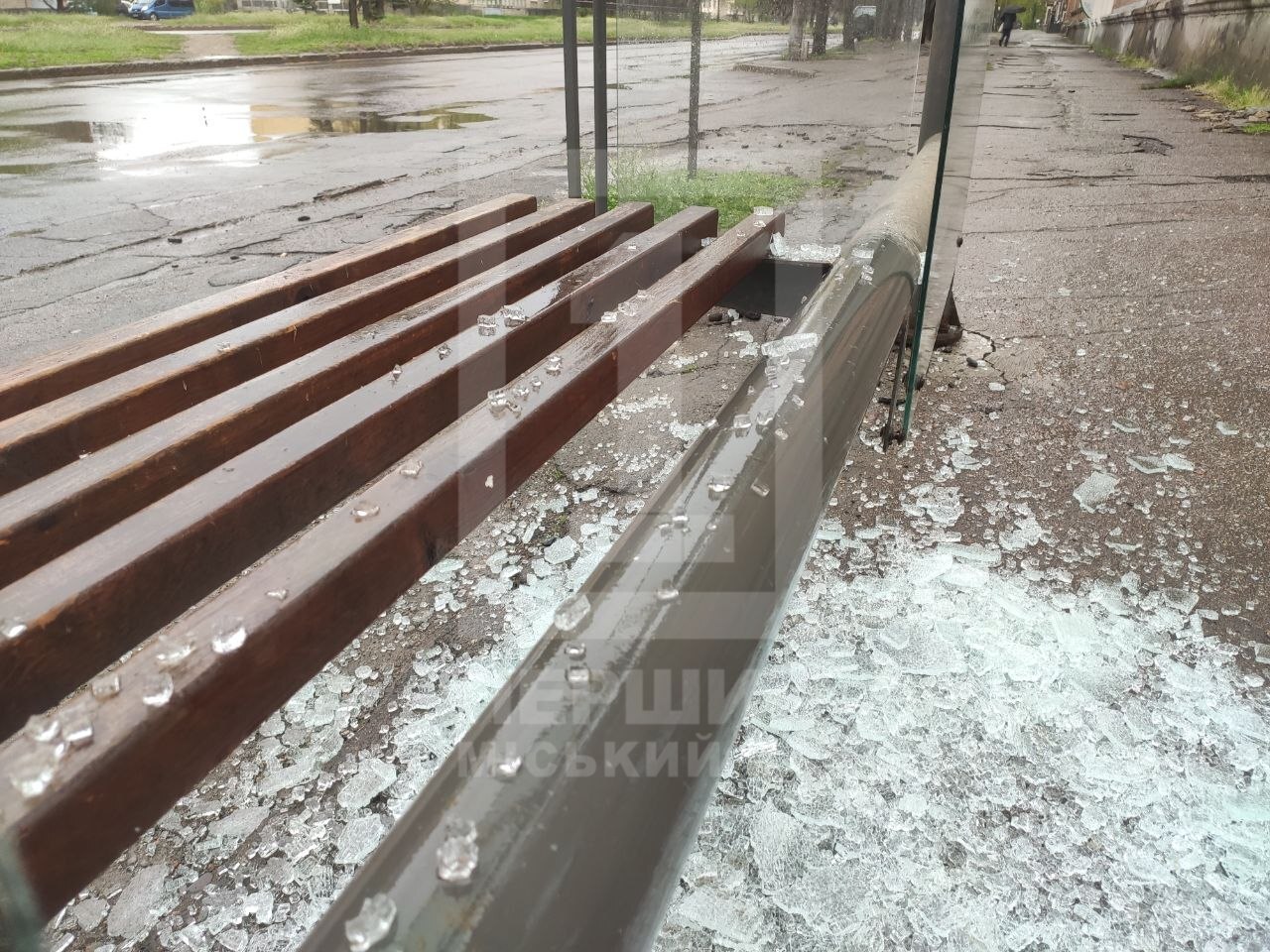 Инцидент, вероятно, произошел минувшей ночью. Неизвестные разбили стеклянный павильон остановки "улица Алмазная". Друзья одной из задних панелей укрыли не только землю поблизости, но и скамейку для ожидания.