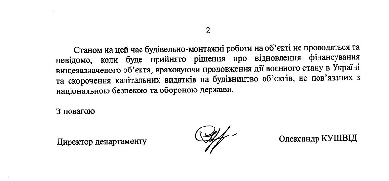 "В дальнейшем, Президент Украины, Правительство, общественные организации неоднократно отмечали нецелесообразность выполнения строительно-монтажных работ на объектах спортивной инфраструктуры во время действия военного положения, введенного Указом Президента Украины от 24 февраля 2022 года № 64/2022 "О введении военного положения в Украине" в связи с вторжением войск российской федерации на территорию Украины и ведением полномасштабных боевых действий на всей территории государства. Учитывая отсутствие финансирования, а также ряд объективных причин, которые делали невозможным дальнейшее выполнение строительно-монтажных работ на объекте, заказчик и подрядчик пришли к согласию расторгнуть Договор № 415/11-21 от ЗО. 11.2021 с согласия сторон путем подписания соответствующего дополнительного соглашения от 09.08.2023 № 10 к договору № 415/11-21 от 30.11.2021", - отмечается в ответе.