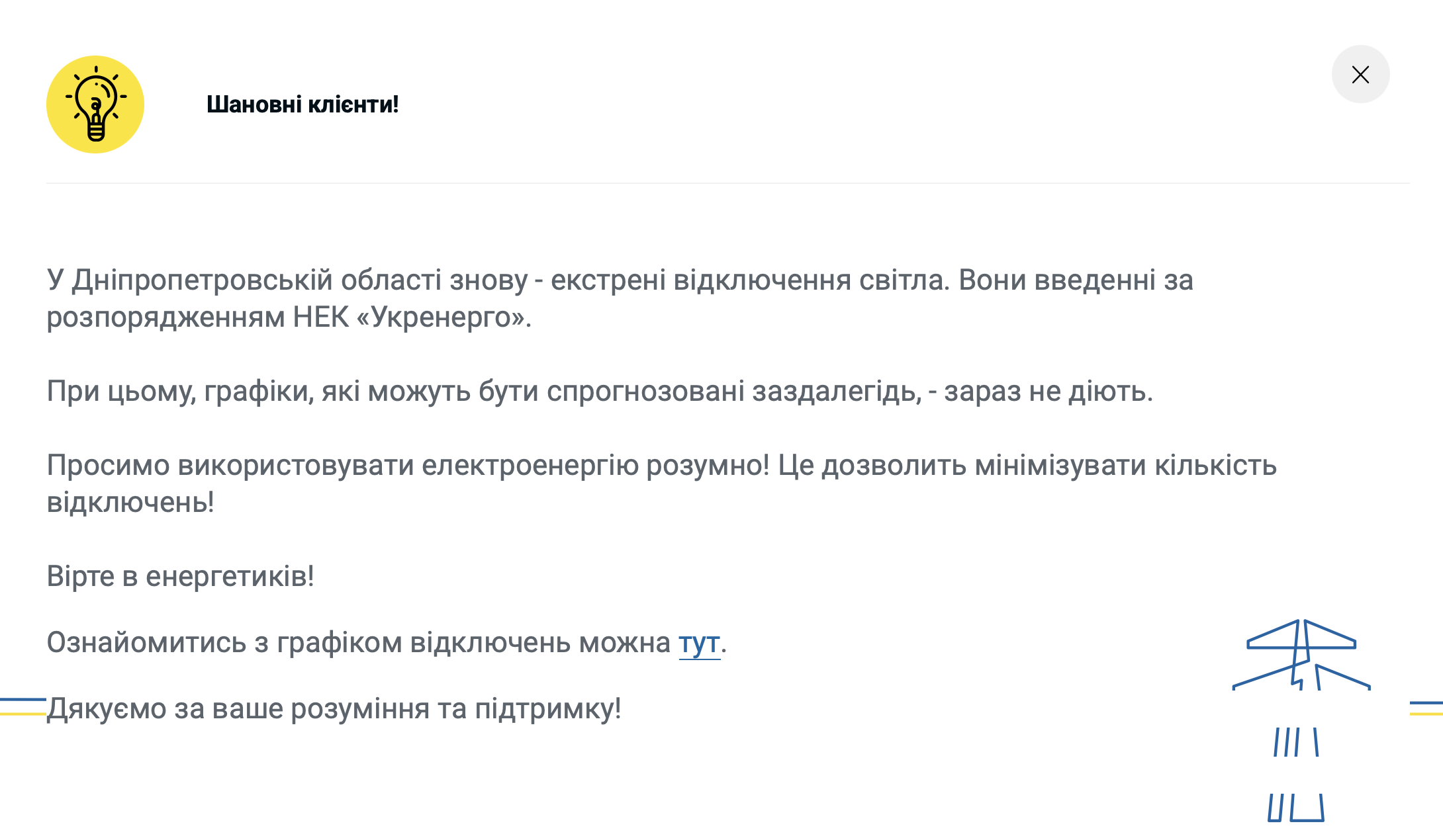 События Графики не действуют: на Днепропетровщине применили экстренные отключения света