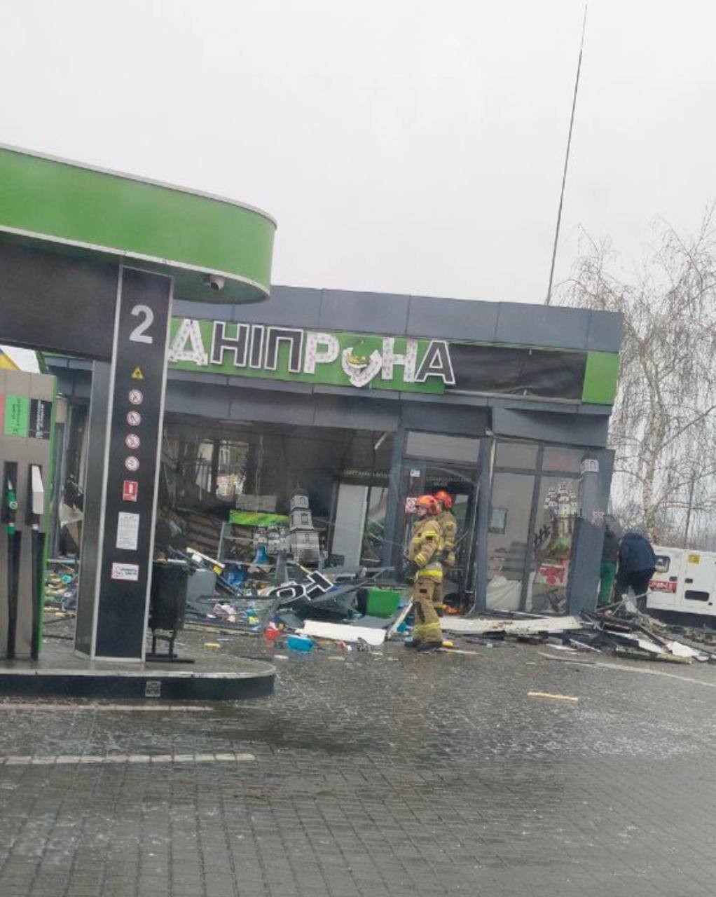 Из-за взрыва повреждено здание заправки. На месте работали спасатели.