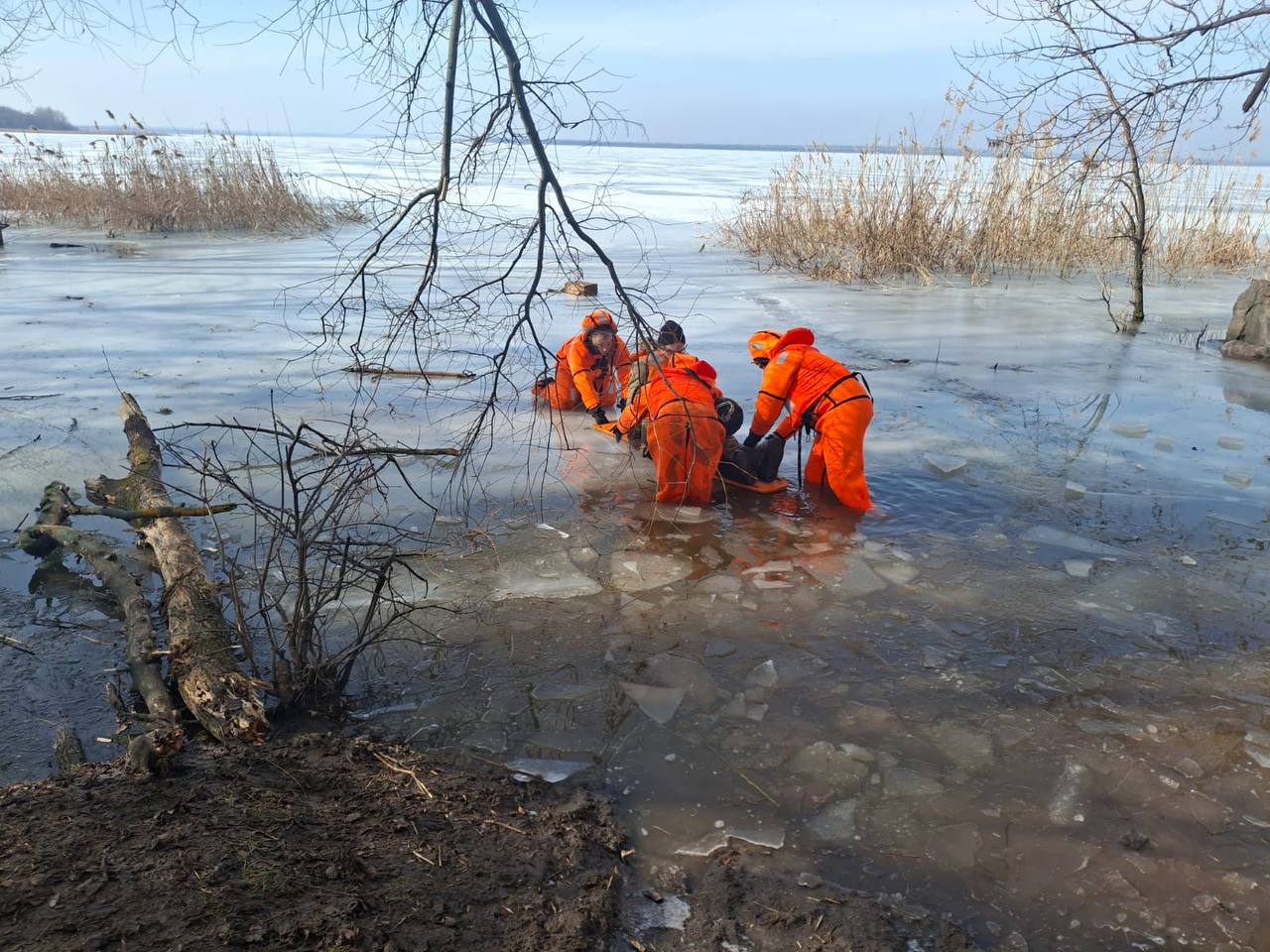 На спасение прибыли сотрудники ГСЧС, которые обнаружили мужчину на льду в десятках метров от берега и с помощью ношей доставили его на сушу, где пострадавшего передали работникам экстренной медицинской помощи.