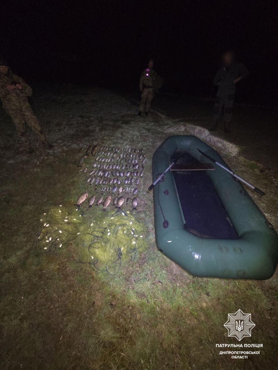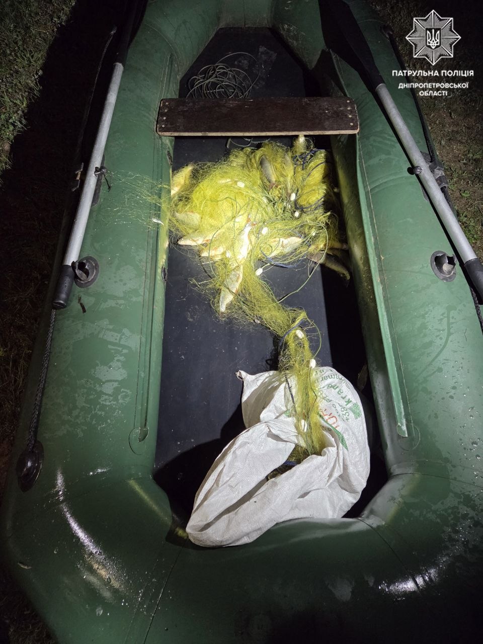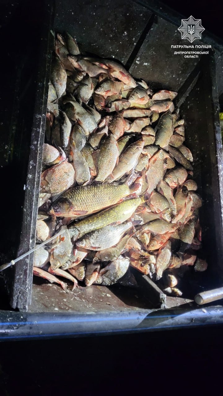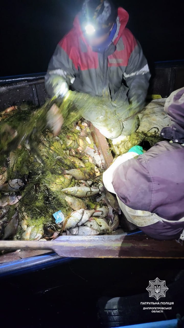 Сегодня ночью, около 2 часов, на реке Днепр в акватории Гребного канала инспекторы заметили лодку с двумя мужчинами, которые вытаскивали из воды сетки. В лодке также уже были такие же орудия ловли со свежевыловленной рыбой, а именно: