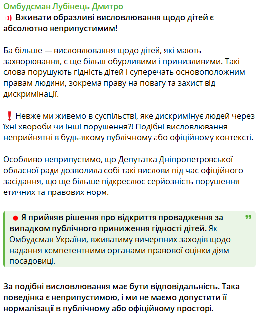 Впрочем, история не угасла, а наоборот вышла на новый уровень. Уполномоченный Верховной Рады по правам человека Дмитрий Лубинец открыл производство по публичному унижению достоинства детей. Омбудсман расценил эту ситуацию как нарушающую достоинство детей и противоречащую базовым принципам недискриминации.
