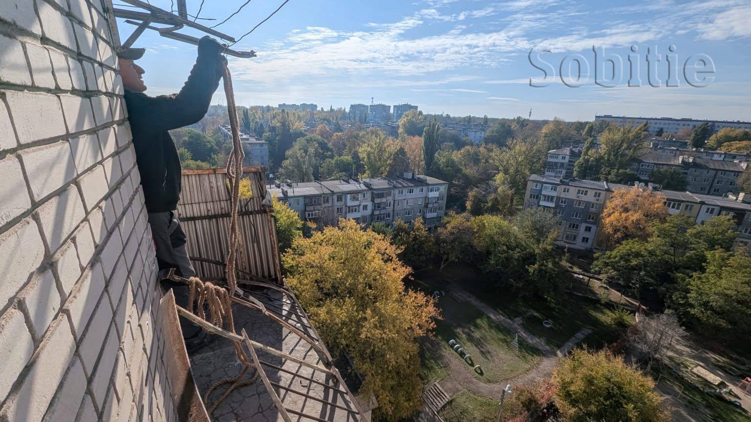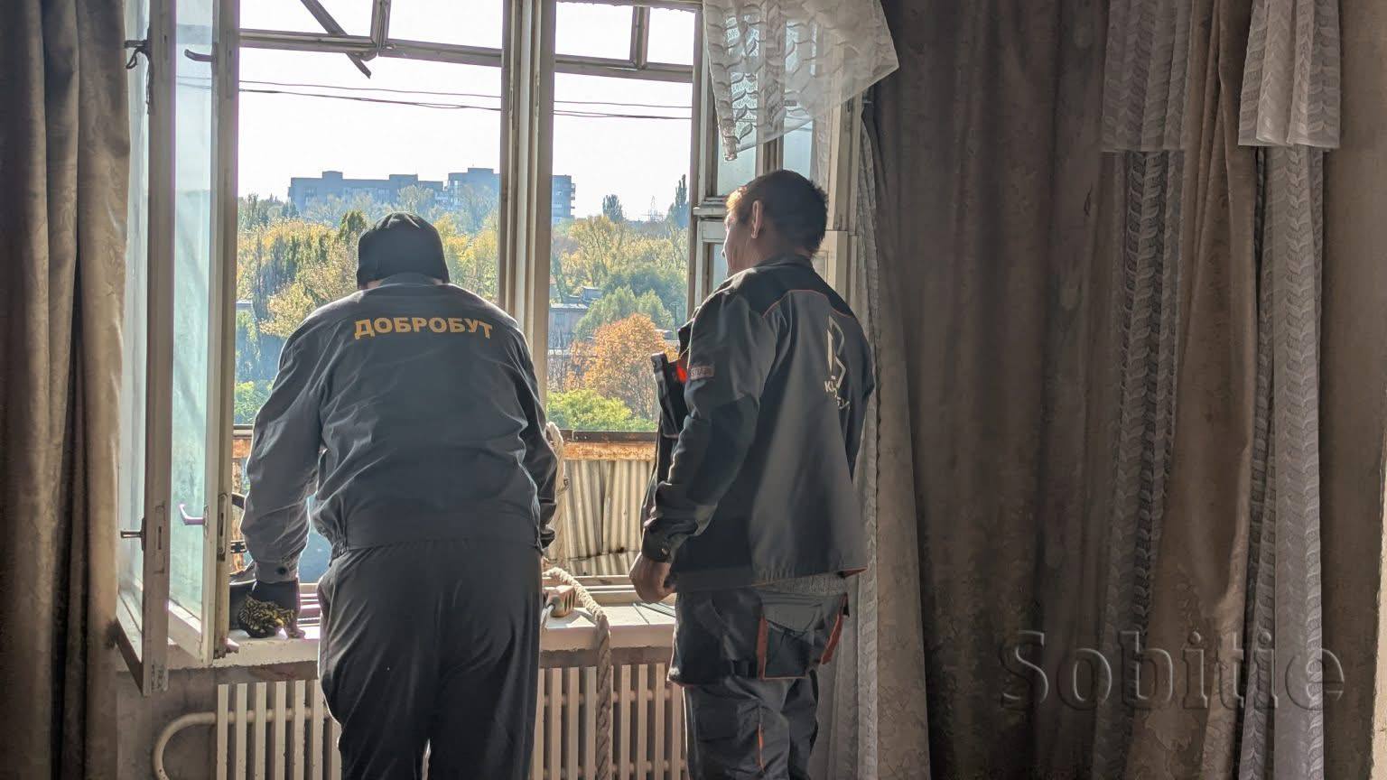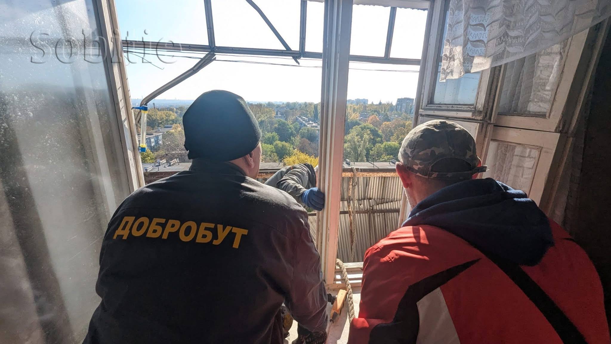Дрон влетел в многоэтажкуК счастью, вражеский БпЛА не разорвалсяВладелица квартиры была в коридоре в момент атакиВид с поврежденного балконаНа месте работают коммунальщикиОстатки вражеского БПЛАЛиквидация последствий обстрела продолжается