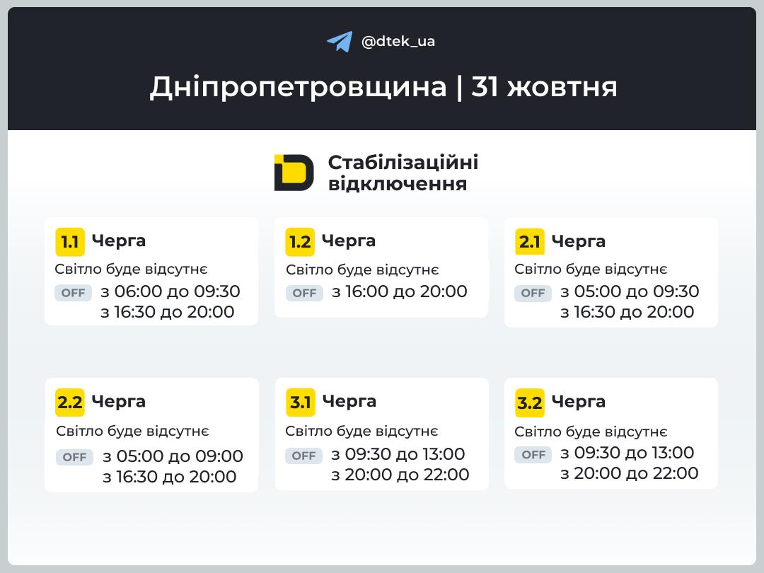 По состоянию на 31 октября, по приказу НЭК Укрэнерго, в Днепропетровской области действуют стабилизационные отключения света , передает "Відомо", со ссылкой на ДТЭК — Днепровские электросети .