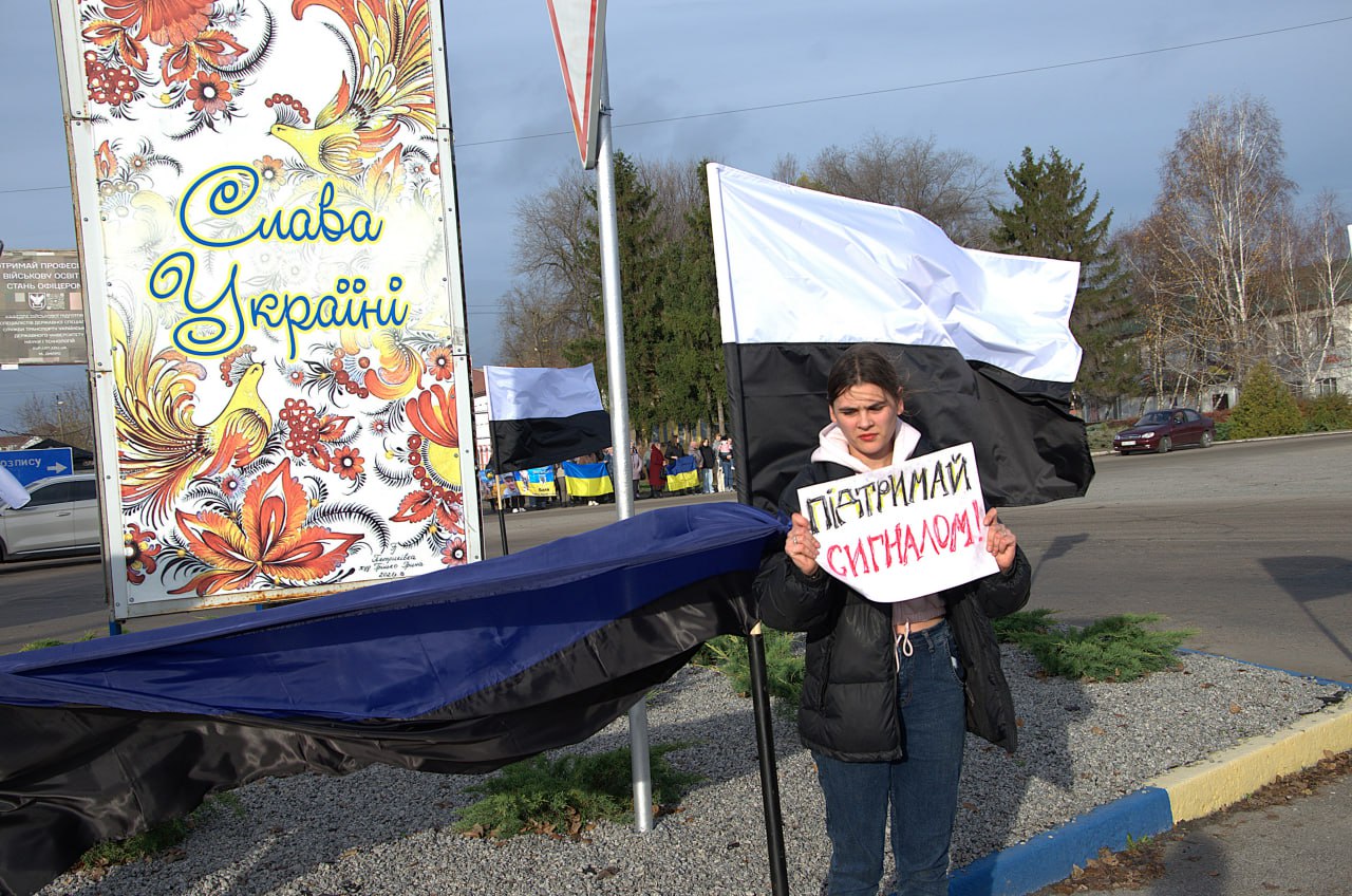 Местом сбора стал центр поселка, где участники разместились у дороги, возле главной транспортной развязки. Вокруг стелы, расписанной фирменным петриковским орнаментом с патриотическими лозунгами "Слава Украине" и "Украина превыше всего", были установлены черно-белые флаги – "Флаги надежды". Это символ борьбы за возвращение военнопленных и честь пропавших без вести: черный символизирует боль, потери и страдания, а белый – надежду, веру и несгибаемое ожидание возвращения.
