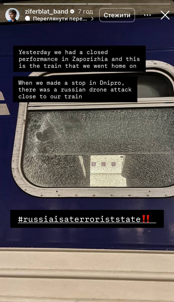 Во время ночной атаки на Днепр под удар российских дронов попали музыканты группы Ziferblat , возвращавшиеся поездом после концерта в Запорожье. По словам участников коллектива, взрывная волна накрыла вагоны прямо во время движения. Об этом сообщает "Відомо" со ссылкой на ziferblat_band.