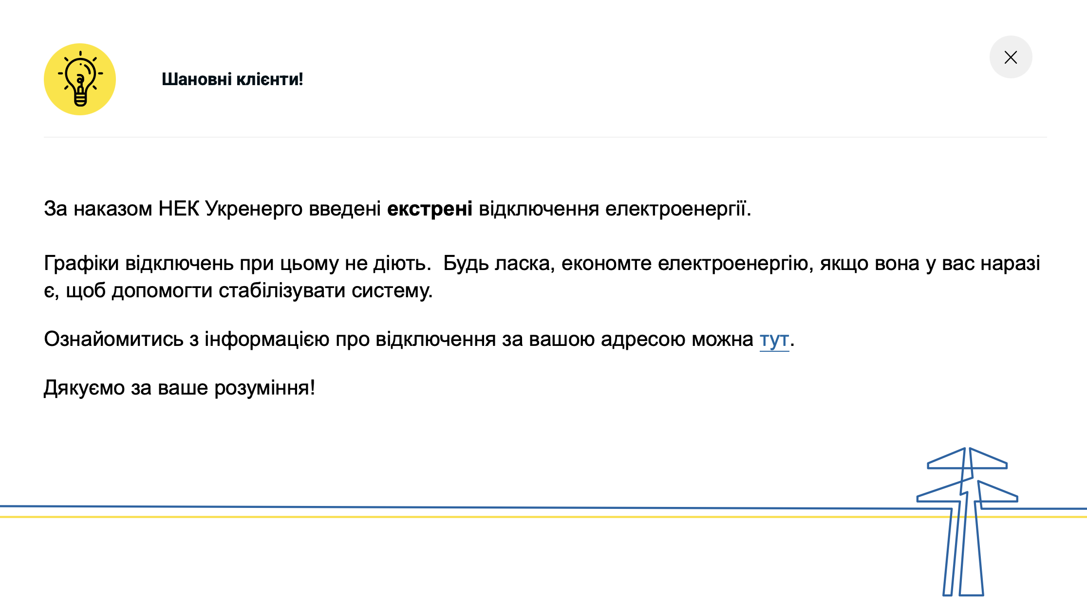 Призываем жителей региона экономно использовать электричество в часы, когда оно есть — это поможет быстрее энергосистеме Украины восстановиться и минимизировать количество отключений.