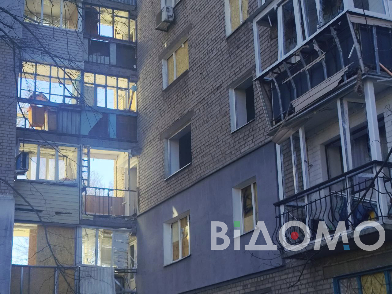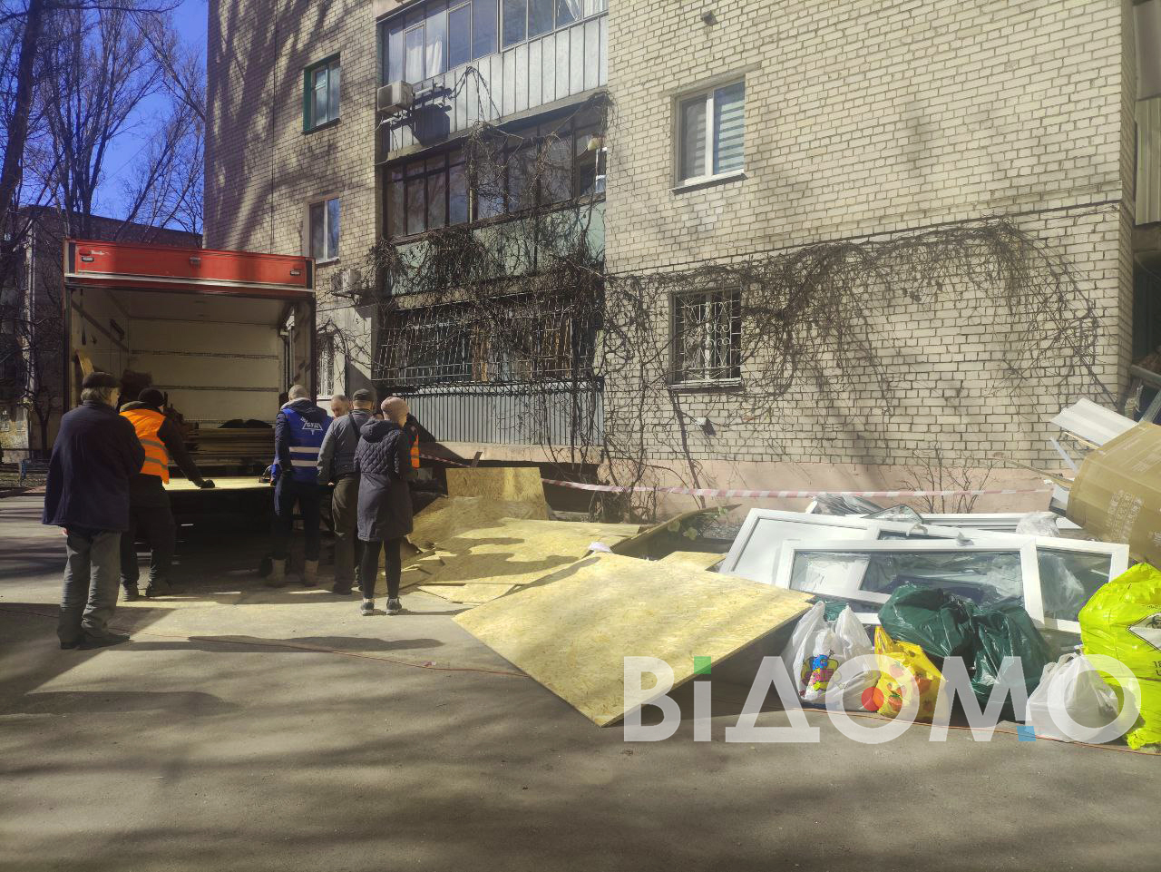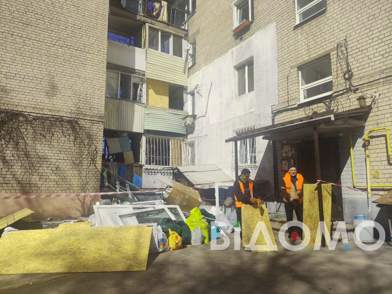Корреспондентка "Відомо", работающая на месте прилета, сообщает, что в одной из девятиэтажек фактически не осталось уцелевших окон. Жители выносят из квартир поврежденные вещи, у дома много стекла и строительного мусора. На месте работает коммунальная техника, а людям выдают ДСП, чтобы временно закрыть выбитые окна.