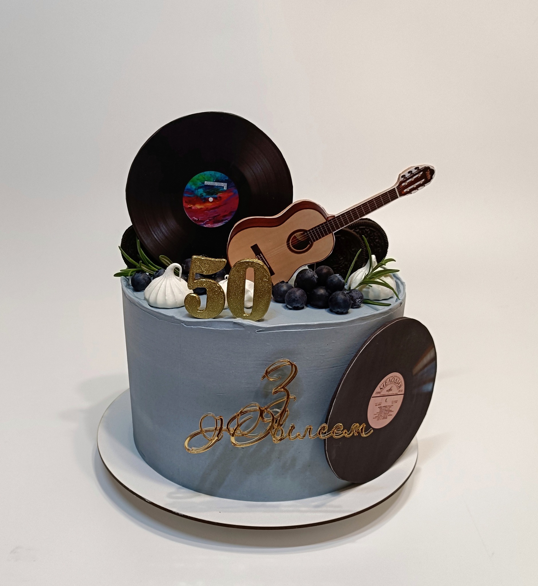 Як видно на фото, торт присячений справжньому меломану. Тут є і платівки, і гітара. Усі деталі виконані максимально реалістично.