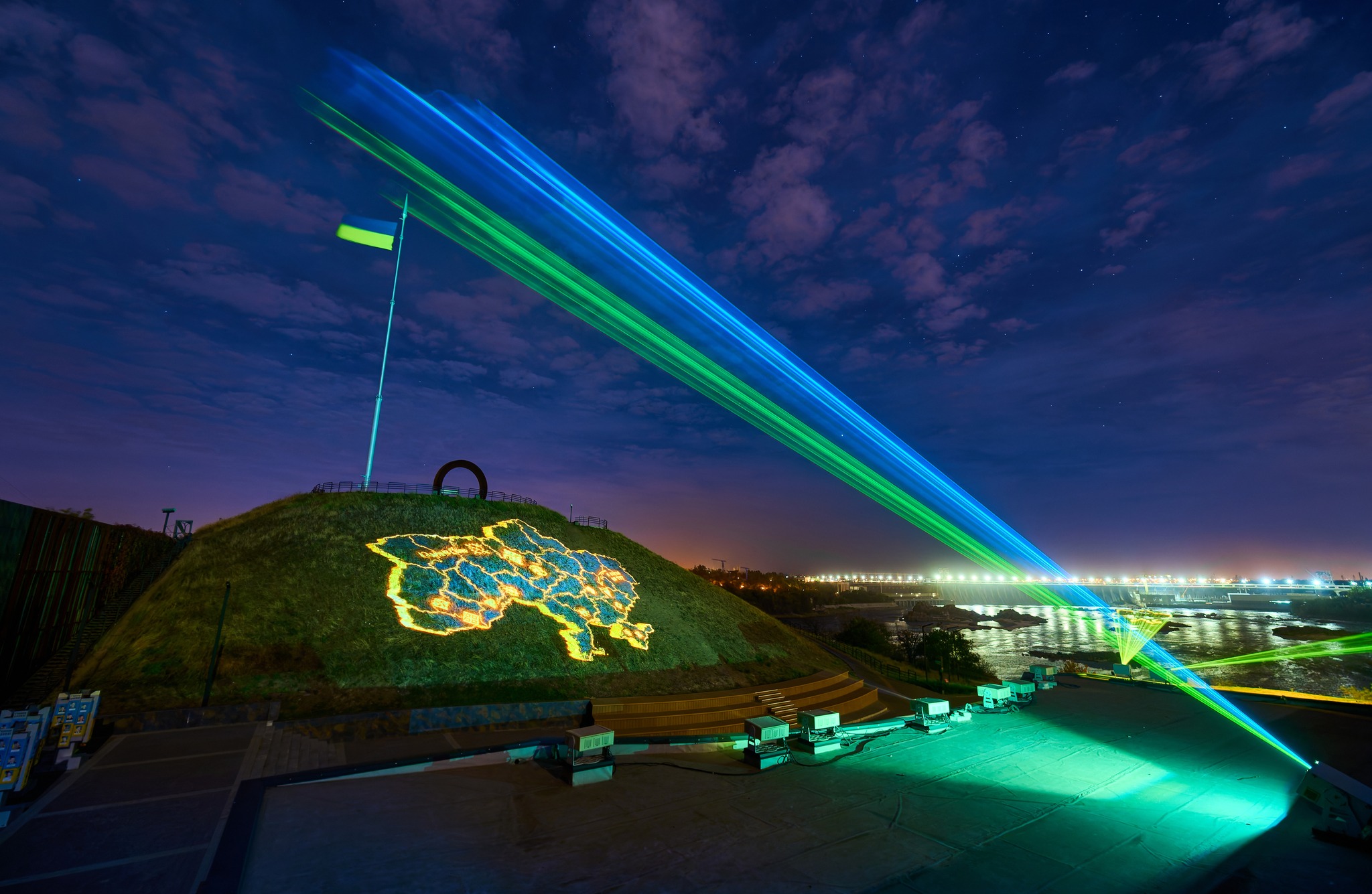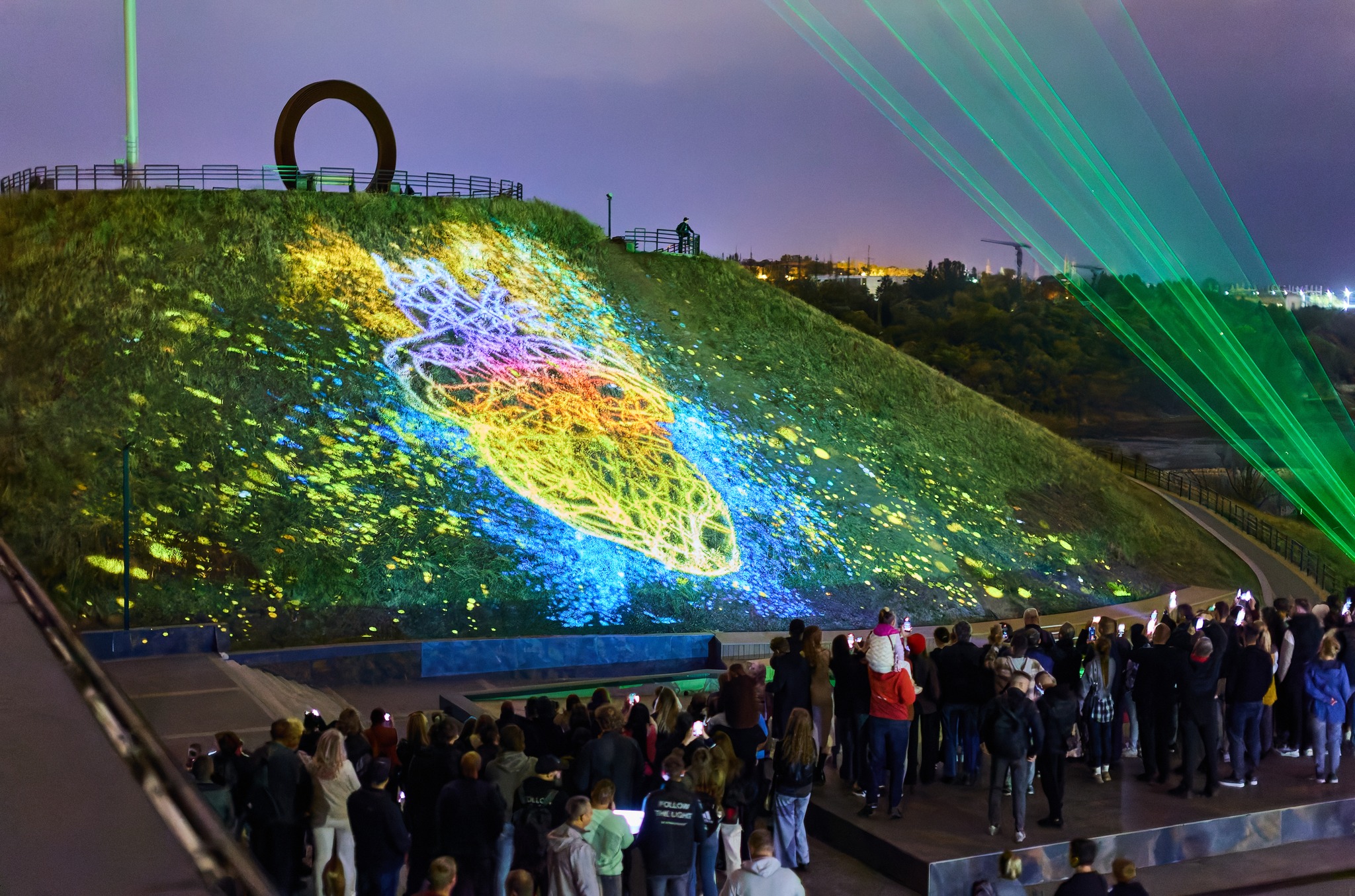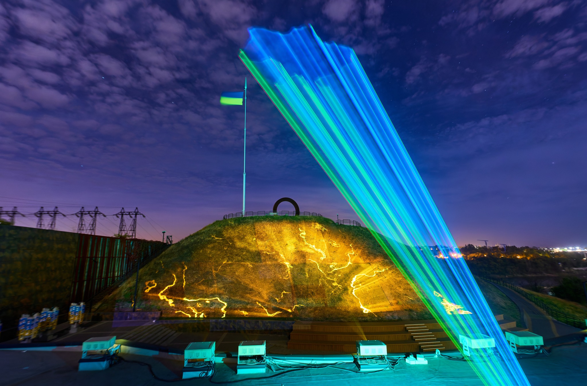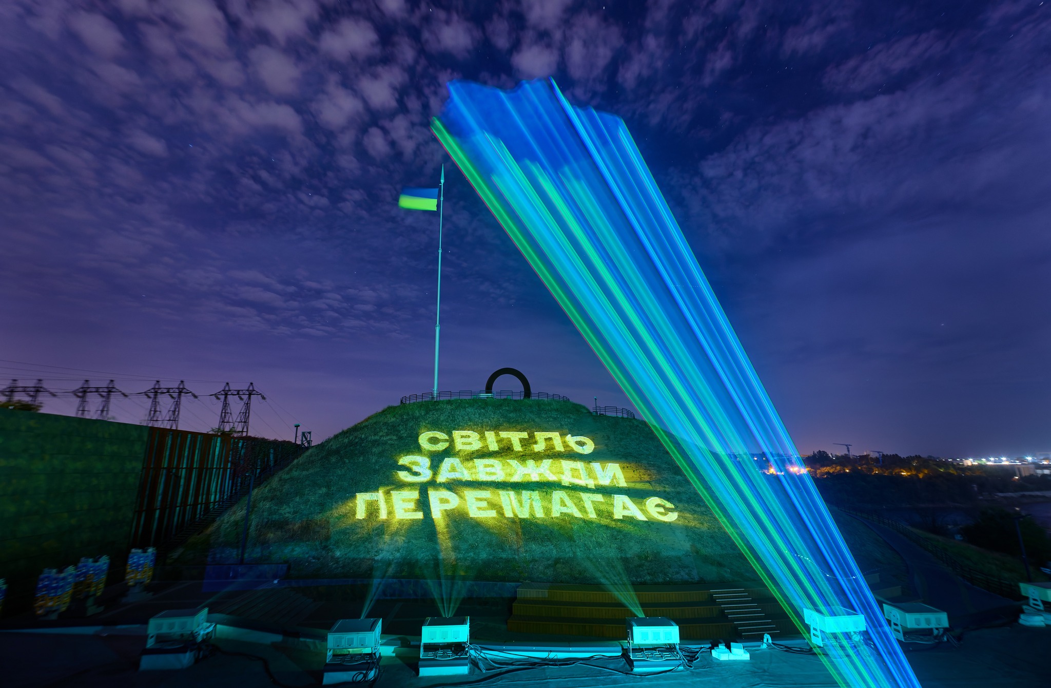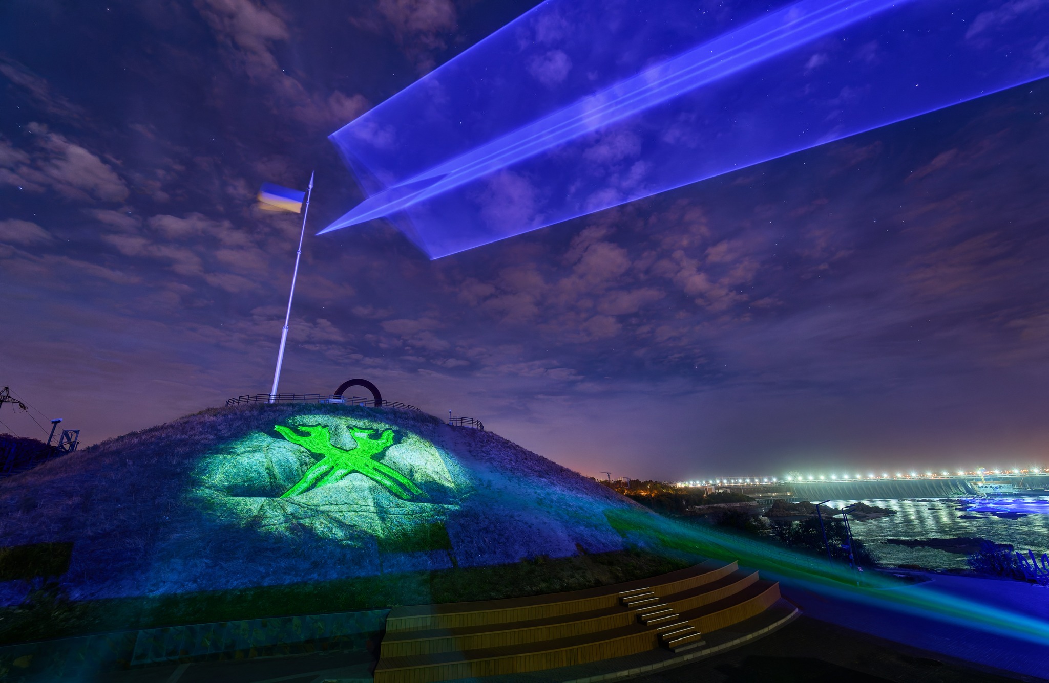 Світлова інсталяція інтегрувалася у природний ландшафт Національного заповідника "Хортиця": курган, скелі та простір над Дніпром стали частиною художнього полотна.