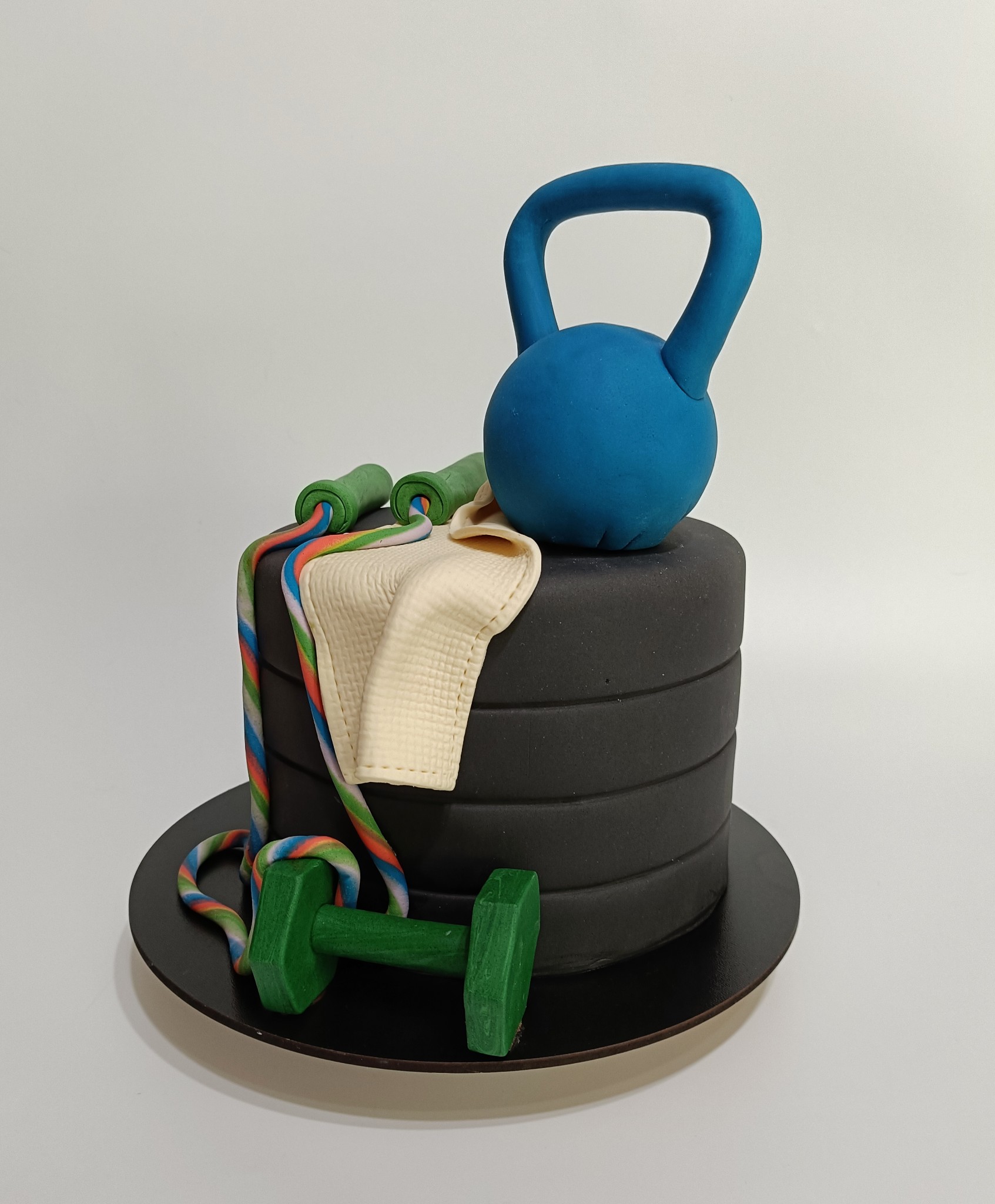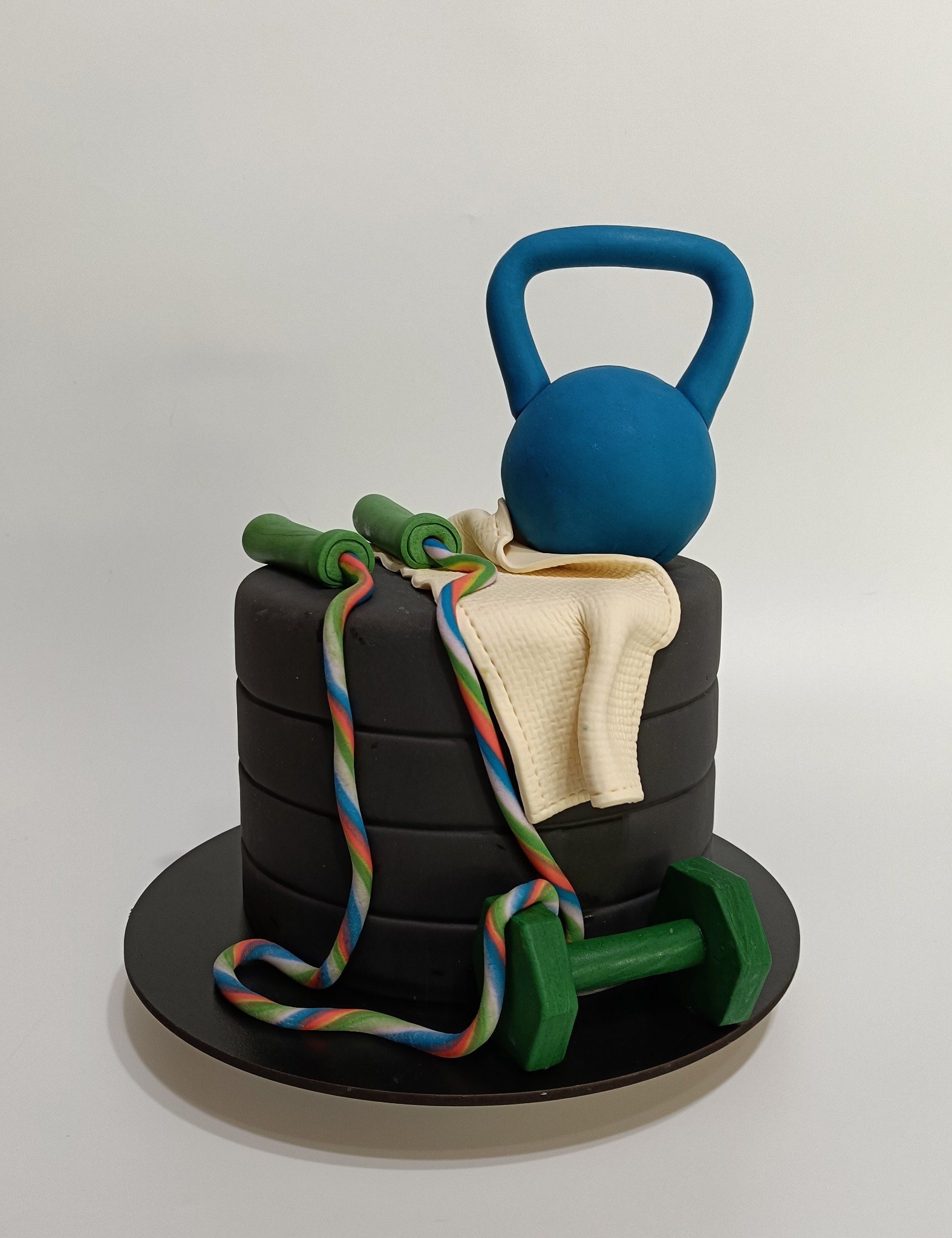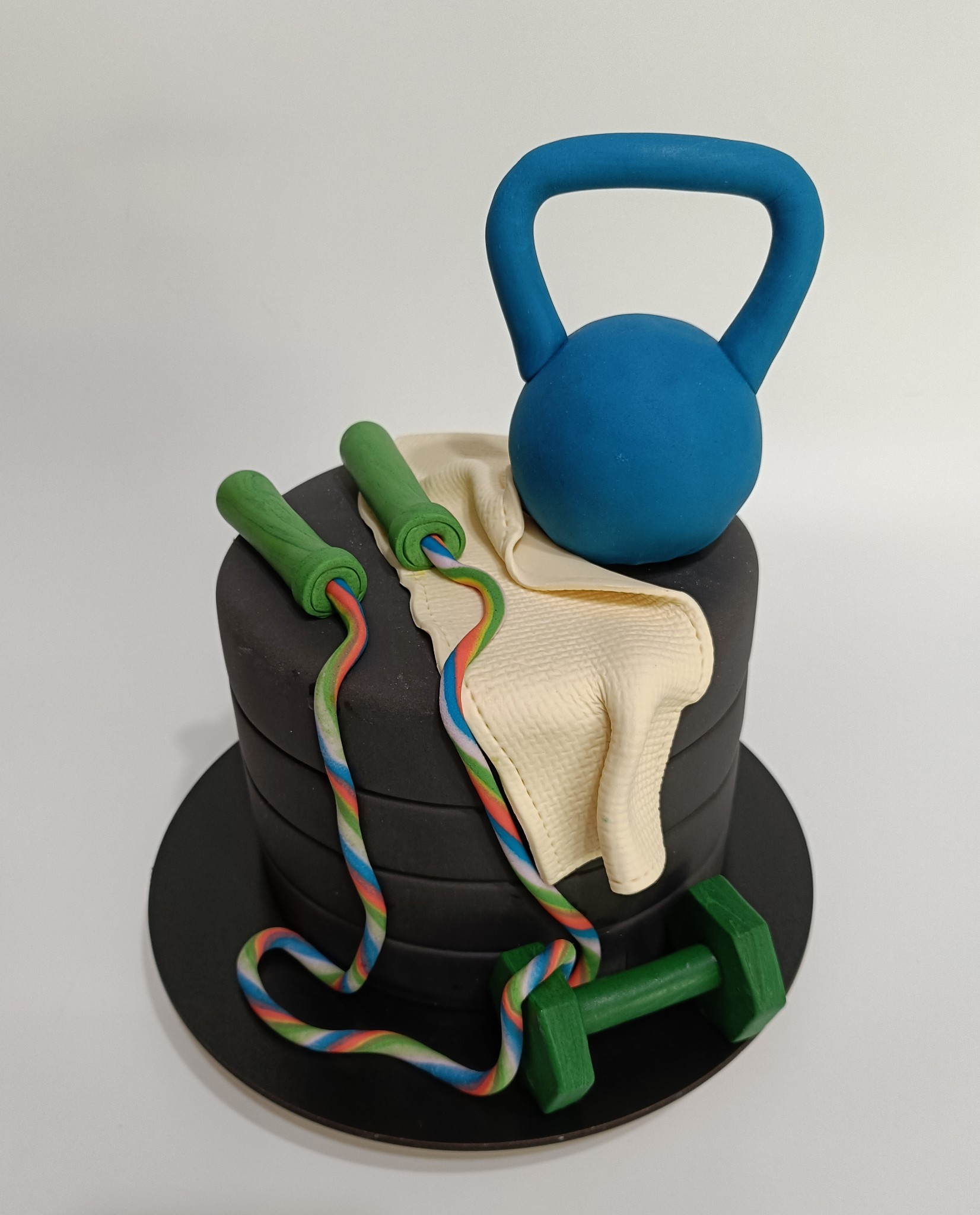 Торт, ймовірно, призначений для людини, яка підтримує себе у відмінній фізичній формі. Тут є базові спортивні снаряди для фізичних навантажень: гиря, скакалка та гантеля. Не обійшлося і без рушничка, аби "втертися" після на навантажень.