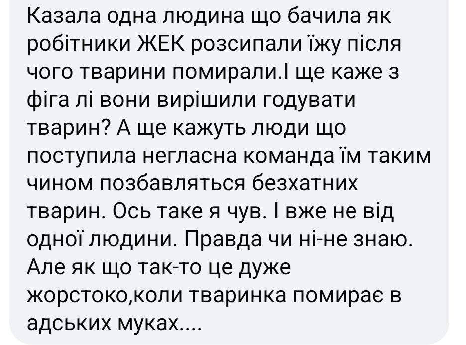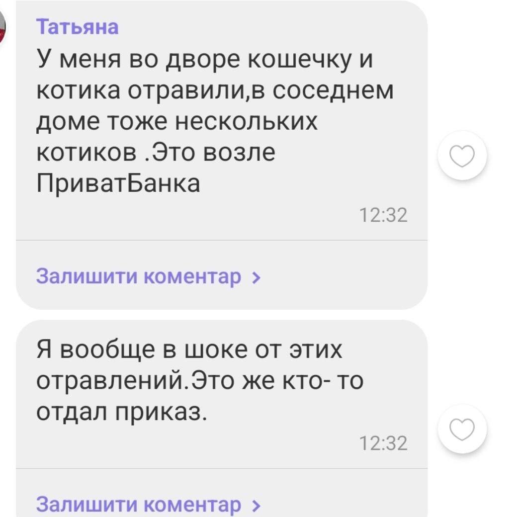 У місцевих чатах містяни скаржаться, що зникають дворові коти, які жили біля будинків роками. Багатьох тварин знаходять мертвими.