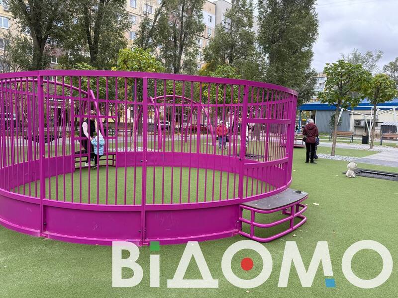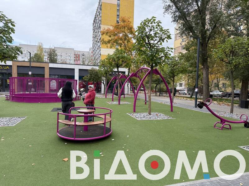 Тут побудований новий інтерактивний дитячий майданчик із цікавими гойдалками: каруселі, наземний батут і огорожа, де можуть вільно бігати дітлахи. А під ними простелене спеціальне гумове покриття, для безпеки малюків.
