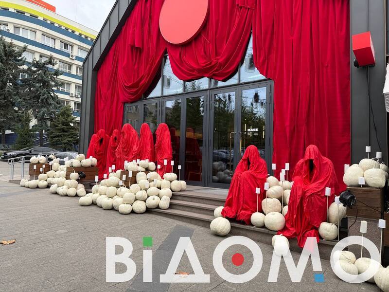 Перша ефектна геловінська локація одразу привертає увагу своїм контрастом кольорів і загадковою атмосферою. Біля входу до будівлі сходи прикрашені десятками світлих гарбузів, що утворюють справжнє "гарбузове море". Серед них — фігури, закутані в червоні тканини, наче безликі привиди або тіні, які застигли в урочистій тиші.