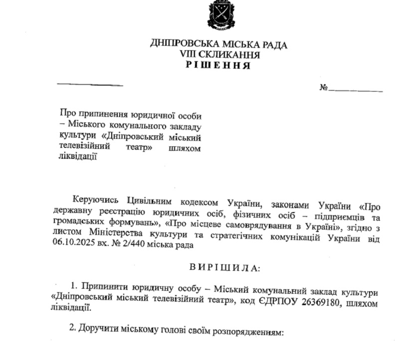 У Дніпрі ліквідують телевізійний театр створений у 2002 році. Працівникам театру доведеться шукати нову роботу. Про це повідомляє "Відомо”.
