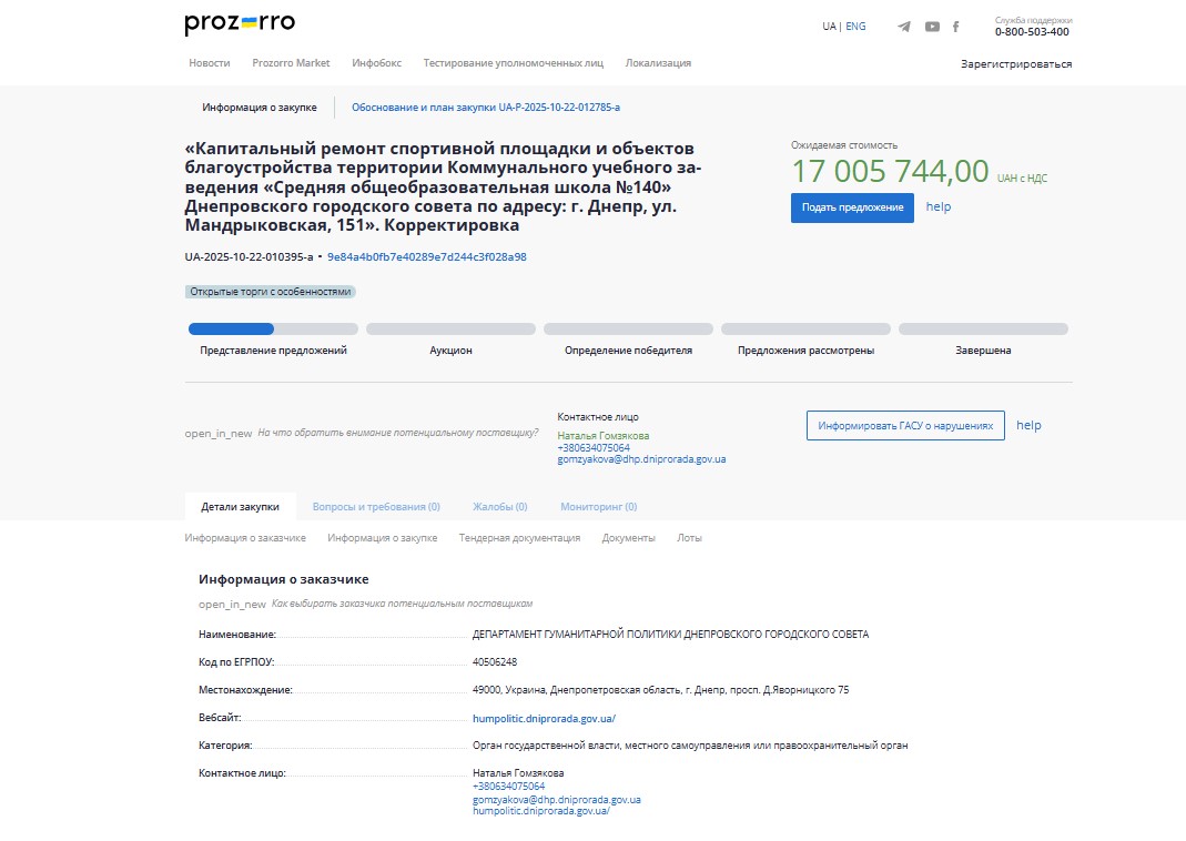 У Дніпрі в умовах війни, що триває, мають намір витратити значні кошти на ремонт шкільної інфраструктури. Згідно з даними, опублікованими в системі публічних закупівель Prozorro, міська влада оголосила тендер на проведення капітального ремонту та благоустрою території школи №140, розташованої на вулиці Мандриківській.