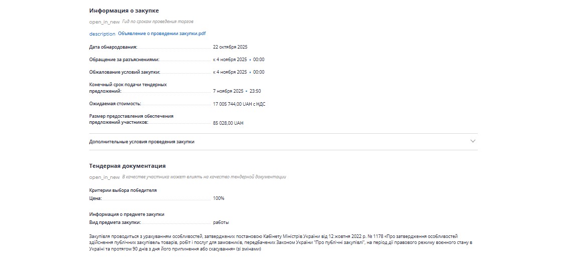Поки тендер перебуває у стадії подання пропозицій та потенційні учасники мають надати документи, що підтверджують кваліфікацію та досвід виконання аналогічних робіт. Замовником виступає одне із міських управлінь, відповідальне за капітальне будівництво.