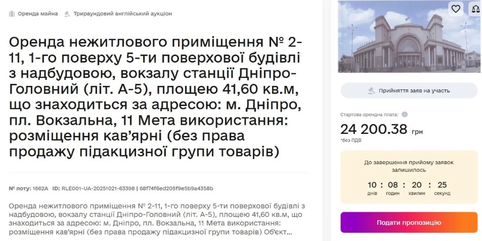 Стартова орендна плата складає 24 200,38 грн. без ПДВ.
