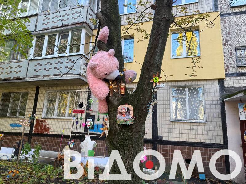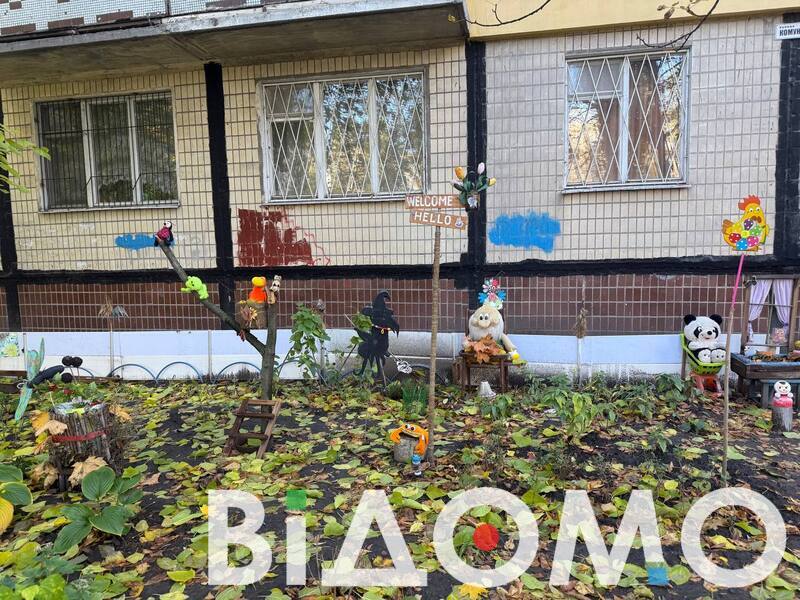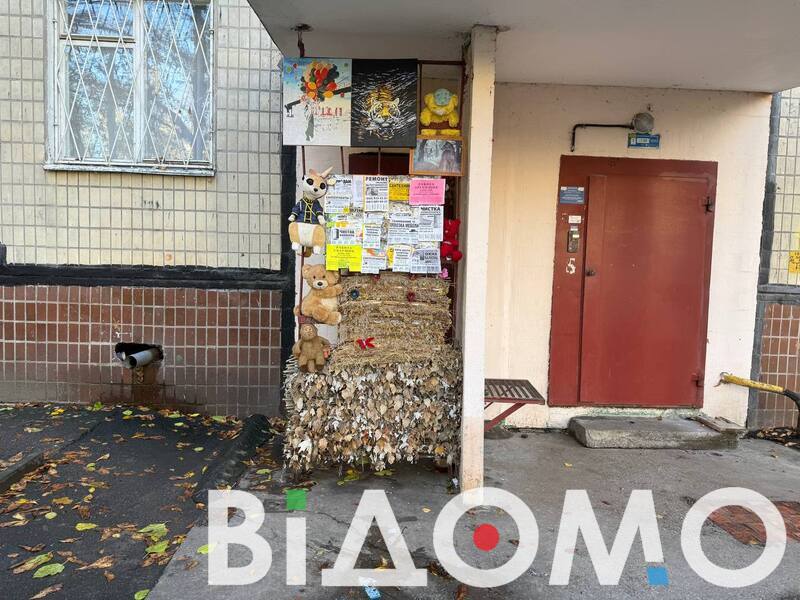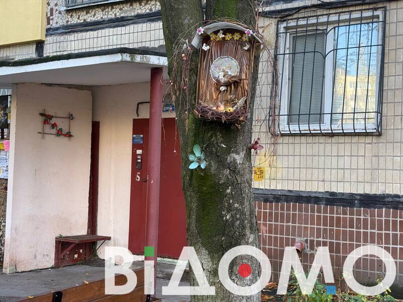 Крім того, жителі створили незвичайний інформаційний стенд: нижня частина оздоблена штучним камуфляжем із сухого листя, а зверху розміщено кілька м’яких іграшок: ведмедики та іграшкові звірята. Над оголошеннями розвішані картини та малюнки, серед яких — зображення дівчинки з повітряними кулями, що додає композиції яскравості й доброти.
