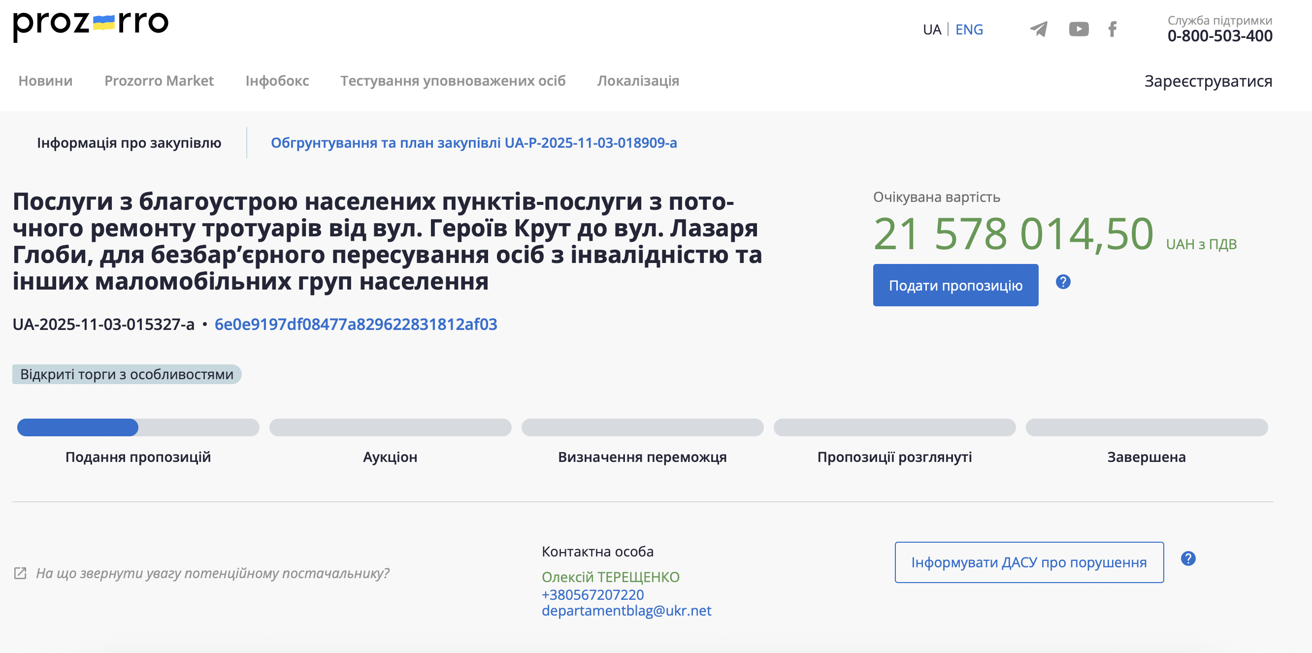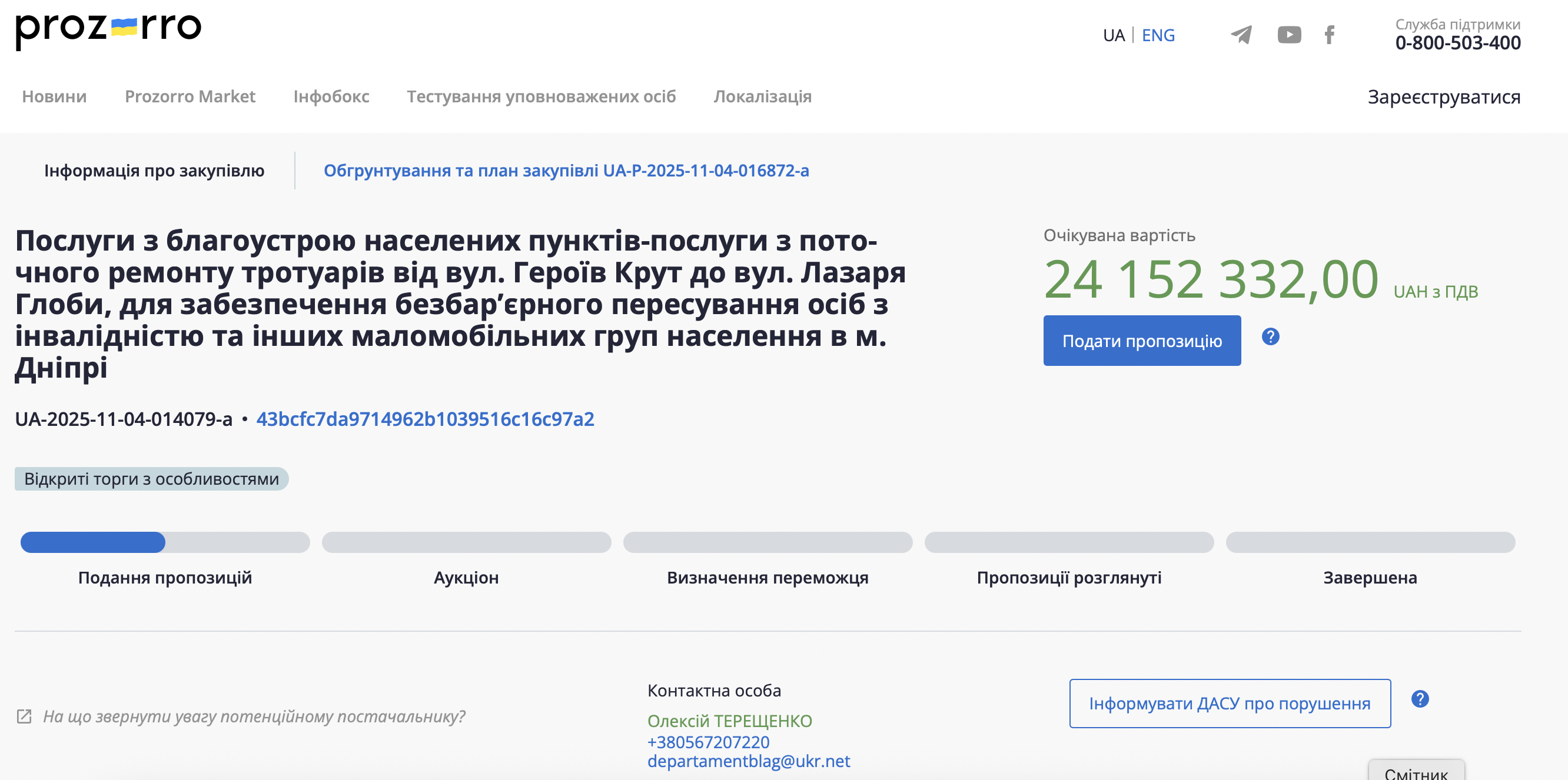 Замовником визначено департамент благоустрою та інфраструктури Дніпровської міськради. Журналісти акцентують — 3 листопада, було оголошено закупівлю на суму 21,5 мільйона гривень, але згодом її скасували через "помилку у предметі закупівлі”. Уже 4 листопада, оприлюднили оновлений тендер — цього разу на 24 мільйони гривень.