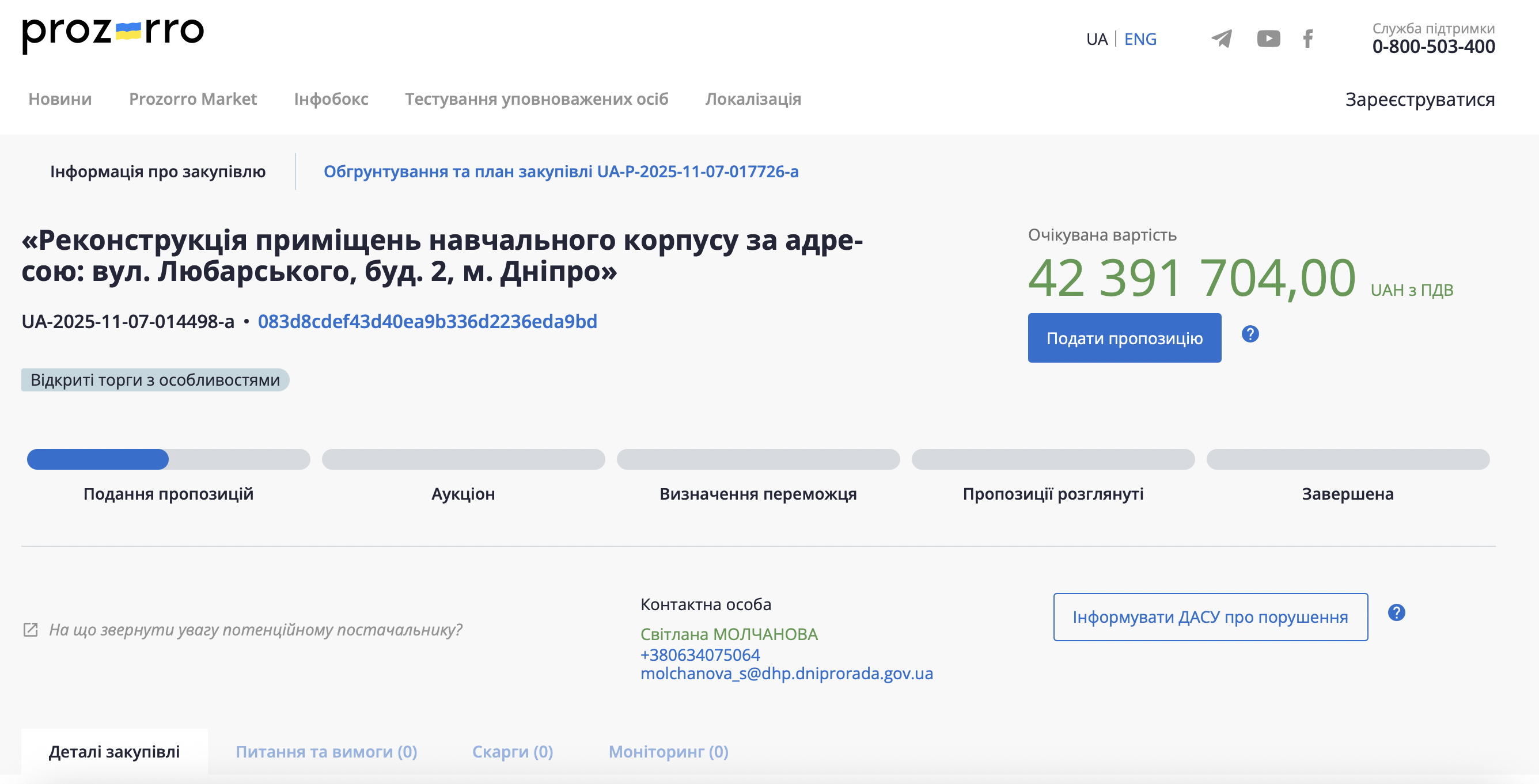 У Дніпрі стартувала процедура закупівлі на реконструкцію навчального корпусу Вищого професійного училища №55. Тендерна документація вже оприлюднена на Prozorro. Очікувана вартість робіт становить 42 391 704 гривень. Про це пише "Відомо".