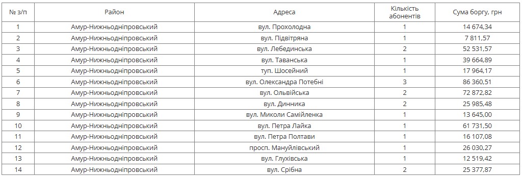 З 1 по 5 грудня 2025 року планується обмеження водопостачання мешканцям приватного сектору Амур-Нижньодніпровського району Дніпра. Зазначається, що розмір неплатежів є рез критично великим – 473 276,49 гривень. Через це чпеціалізована бригада підприємства проведе відключення послуги за адресами, зазначеними у списку: