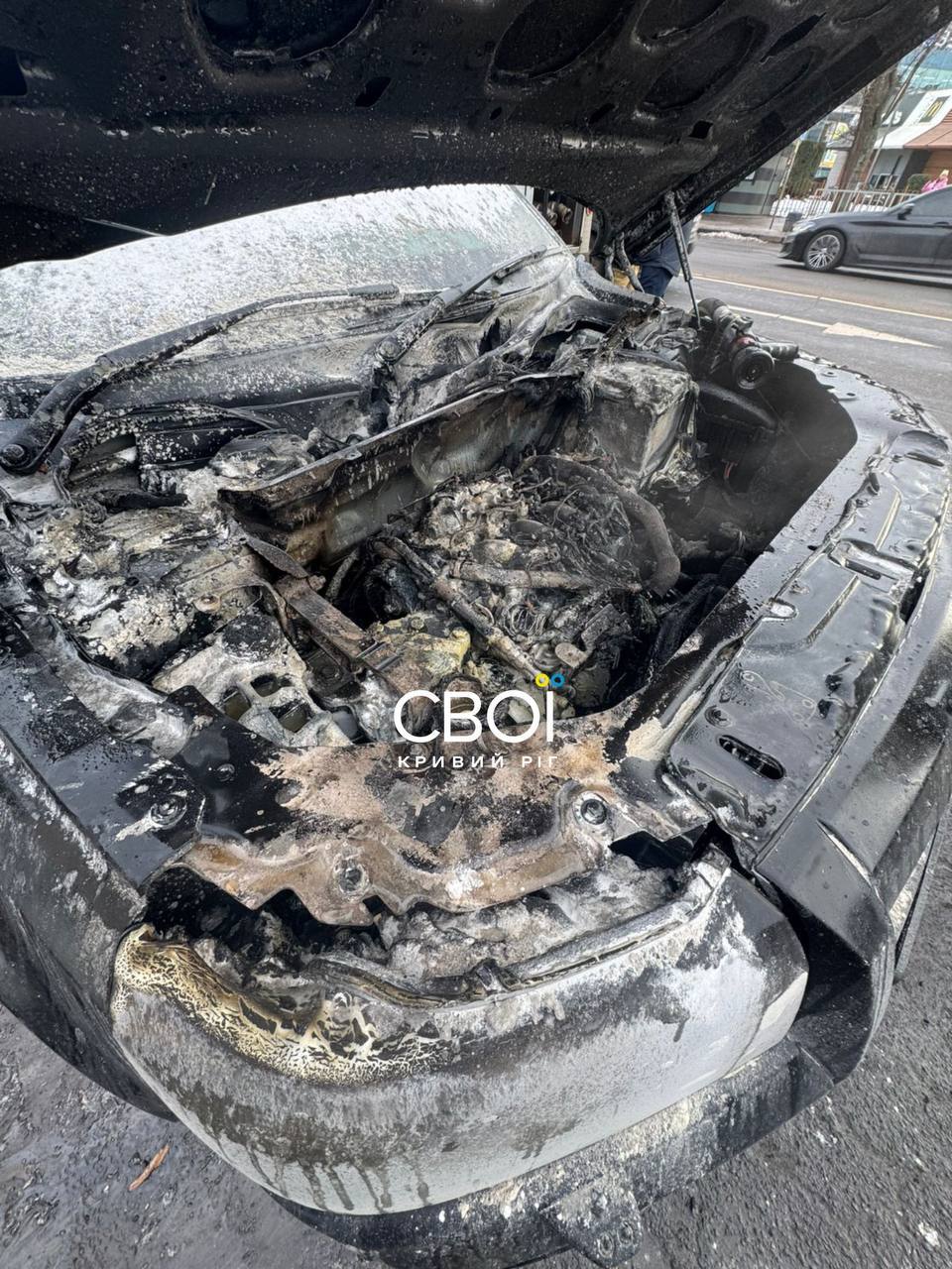 Попередньо, причиною займання стало коротке замикання у моторному відсіку. Як видно на фото, машина отримала суттєві пошкодження. Пожежу ліквідували рятувальники.