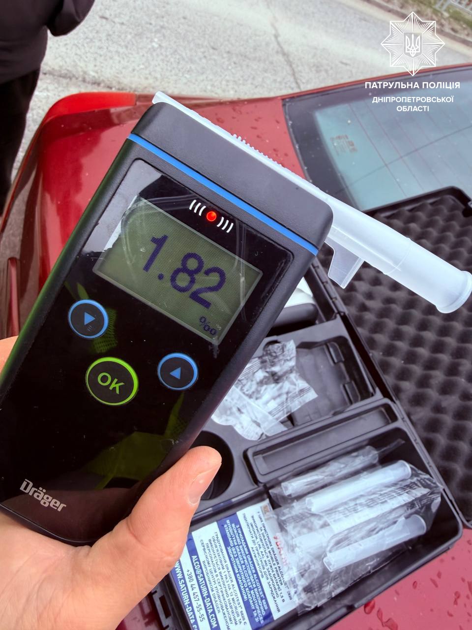Під час спілкування з водієм Chevrolet інспектори помітили у нього ознаки алкогольного сп'яніння. Чоловік пройшов освідування за допомогою Драгеру. Результат підтвердив, що кермувальник нетверезий — в його крові було 1,82 проміле алкоголю.