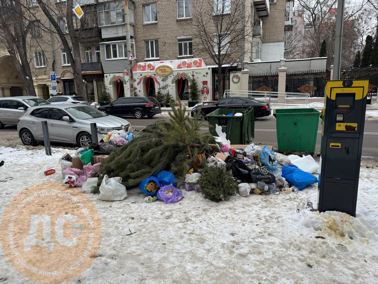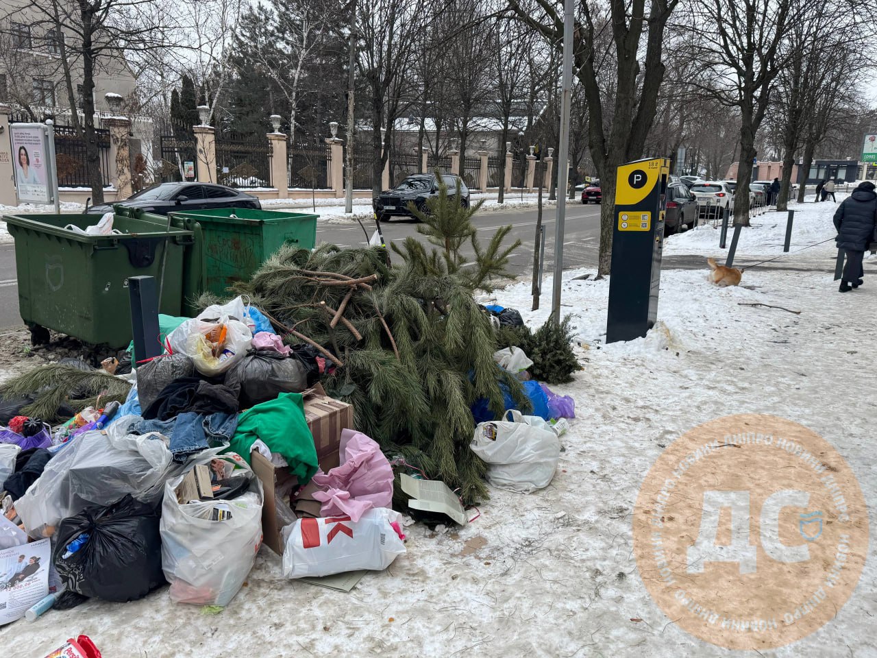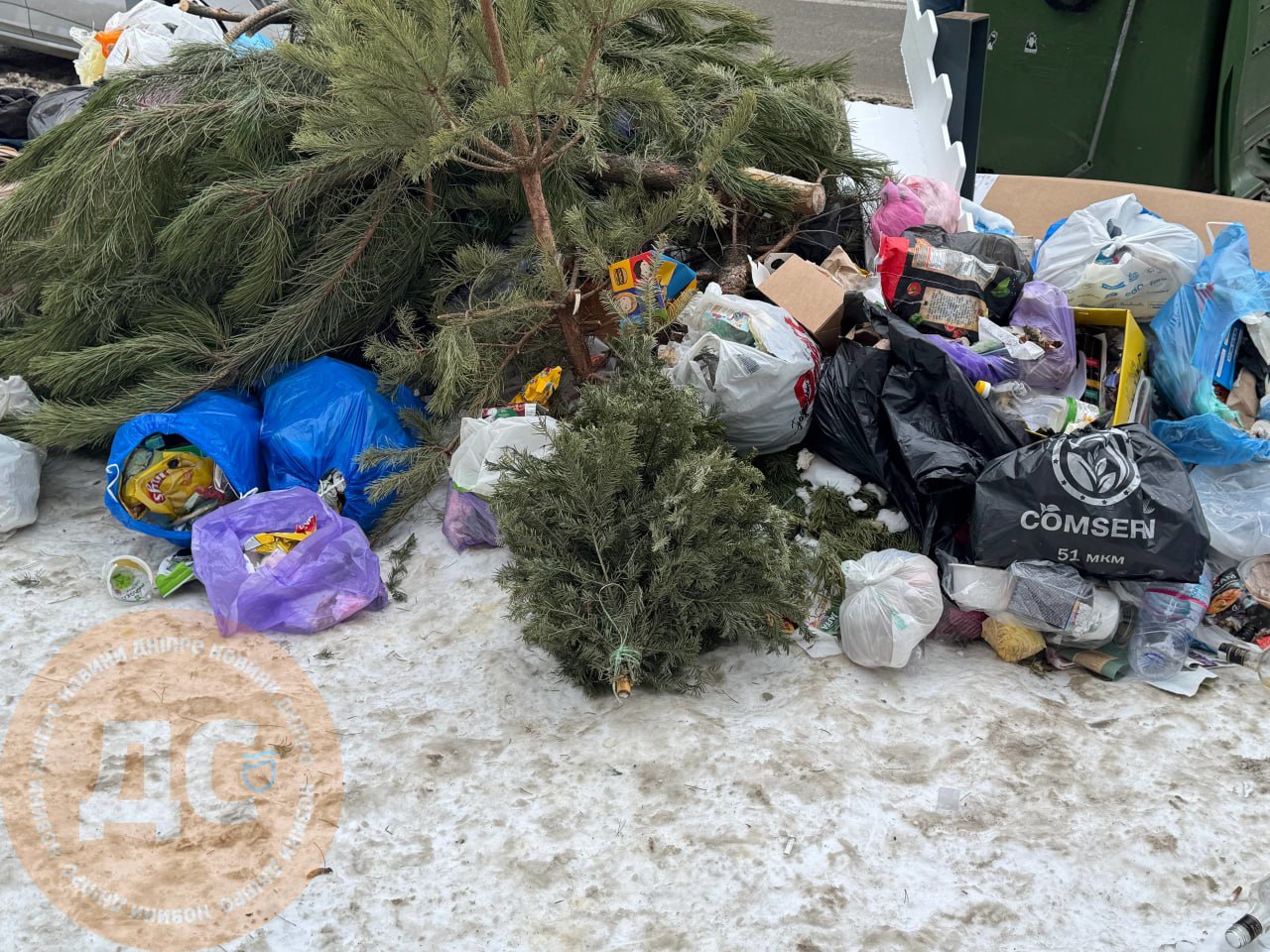 Як видно на фото, контейнери переповнені побутовими відходами, а непотріб уже починає розноситися вітром по прилеглій території. Крім того, люди викинули ялинки після новорічних свят, через що площа стихійного звалища значно збільшилася.