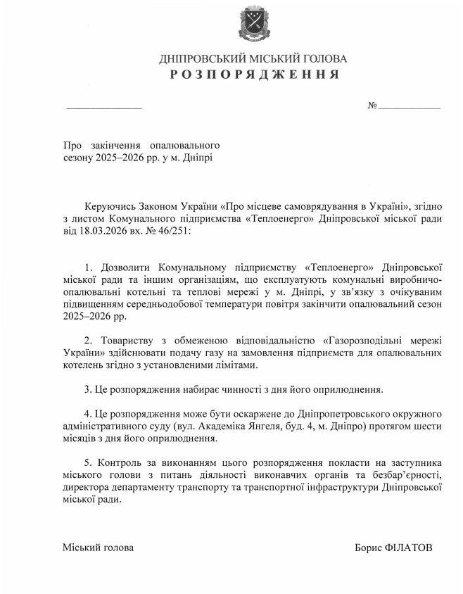 КП "Теплоенерго” Дніпровської міської ради та інші організації, які постачають тепло містянам, закінчують опалювальний сезон. Згідно документу, таке рішення міська рада прийняла у зв’язку з очікуваним підвищенням середньодобової температури повітря. Також у розпорядженні вказано, що воно набирає чинності з дня оприлюднення.