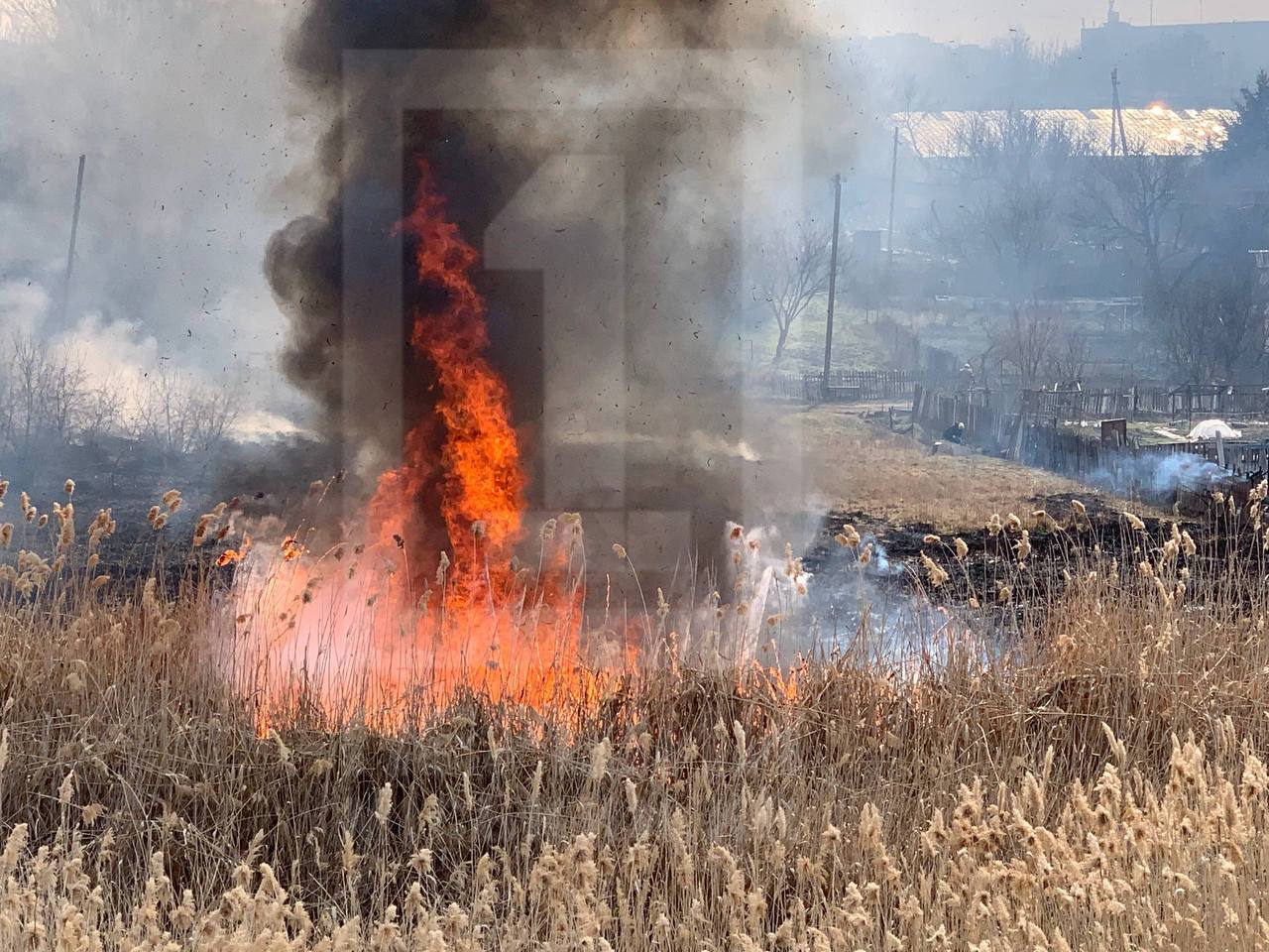 Очерет загорівся поблизу приватного сектору, а вогонь вже подекуди почав наближатися до господарських будинків. Над місцем займання здіймається густий чорний дим.
