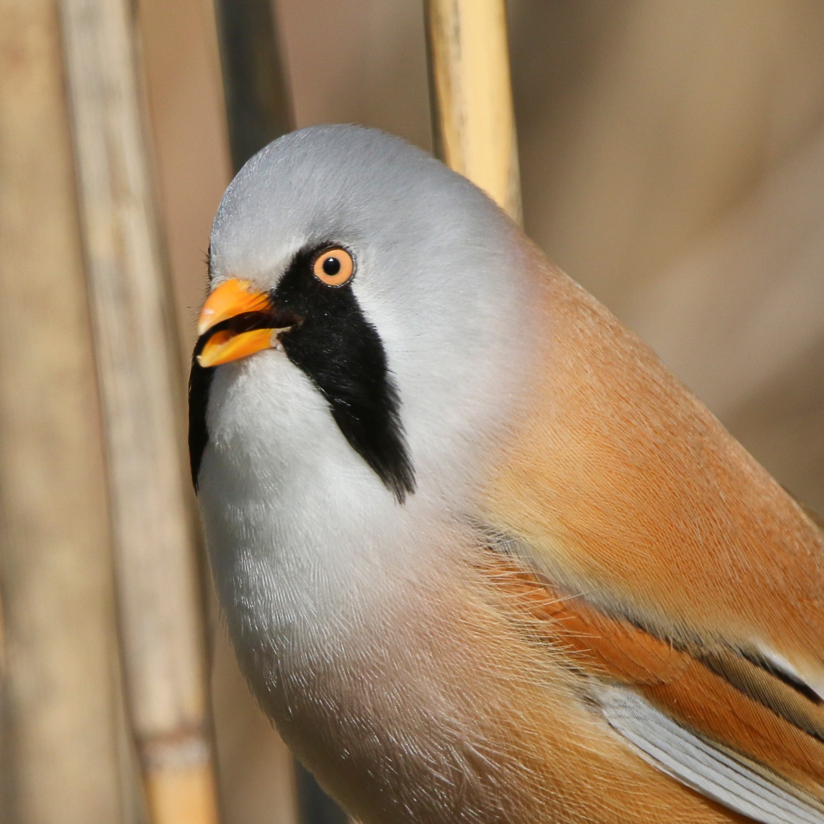 Вусата синиця розміром майже з велику синицю. Шлюбне вбрання самця яскраве: голова сіро-блакитна з довгими чорними вусами від дзьоба до грудей. Їм додає виразності пір`я, яке виступає над гладеньким оперенням. Забарвлення вздовж спини іржаво-коричневе, на крилах два повздовжніх "дзеркальця". Низ тіла білий, з рожевим відтінком на грудях з боків і рудим по боках тіла. Хвіст довгий, рудий, східчастий.