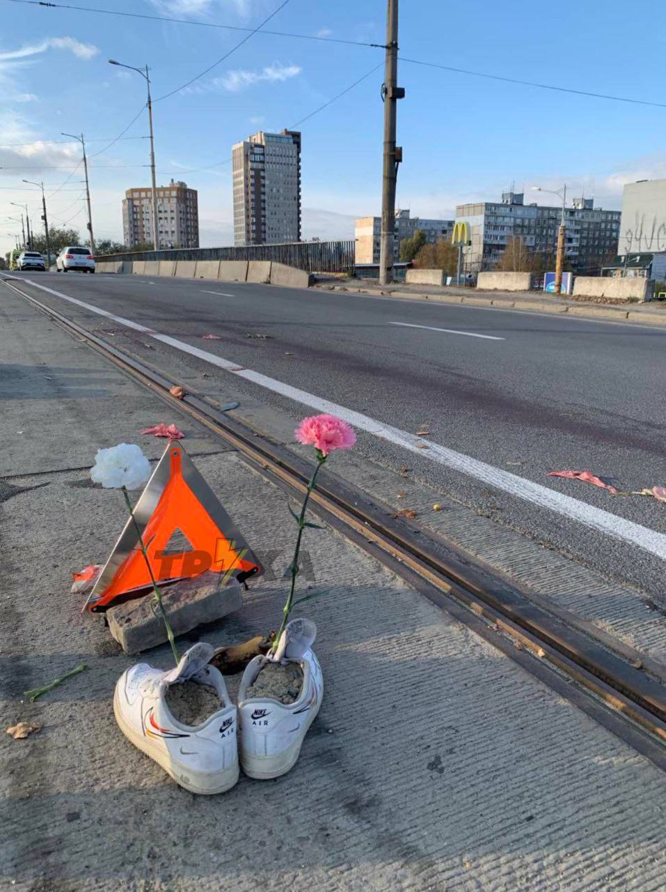 За словами місцевих, саме на віадуці по Мануйлівському проспекті, де трагічно загинув чоловік у ДТП, тепер встановили знак пам’яті. Вшанування не заважає руху транспорту: трамваї на цій ділянці тимчасово не курсують, що дозволяє безпечно відвідати меморіал.