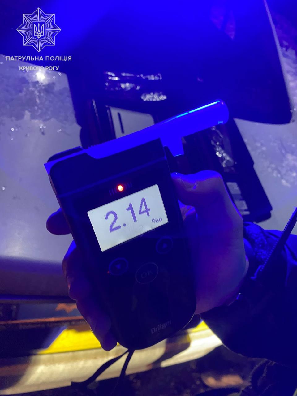 Під час спілкування з водійкою інспектори помітили, що у неї присутні характерні ознаки алкогольного спʼяніння. Жінці запропонували пройти огляд на місці зупинки за допомогою приладу "Драгер" — як результат, 2,14 проміле алкоголю у крові.