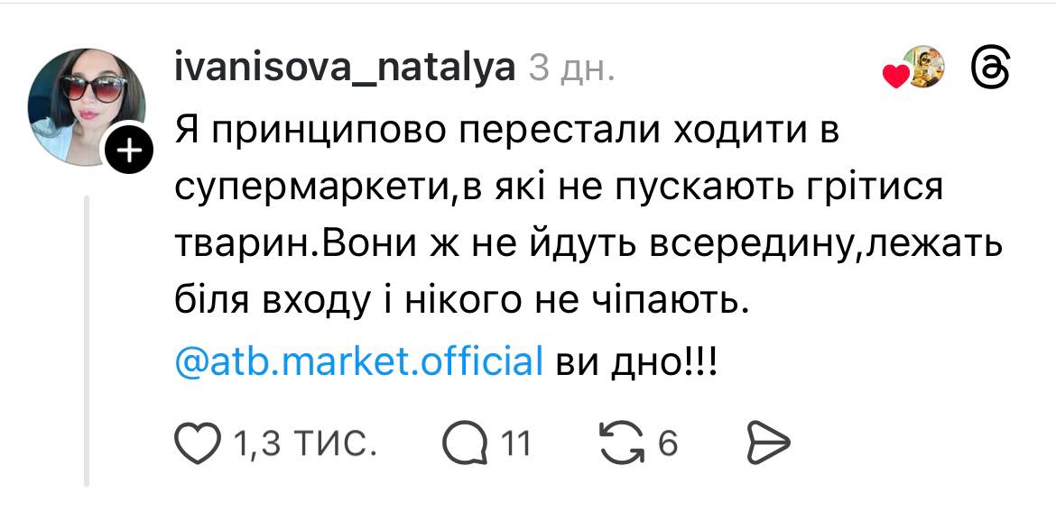 В мережі супермаркетів пояснили ситуацію "санітарними нормами” та скаргами окремих покупців. Там зазначили, що у приміщеннях продуктових магазинів заборонено перебування тварин, зокрема безпритульних. При цьому компанія не підтримує жорстоке, або байдуже ставлення до тварин.