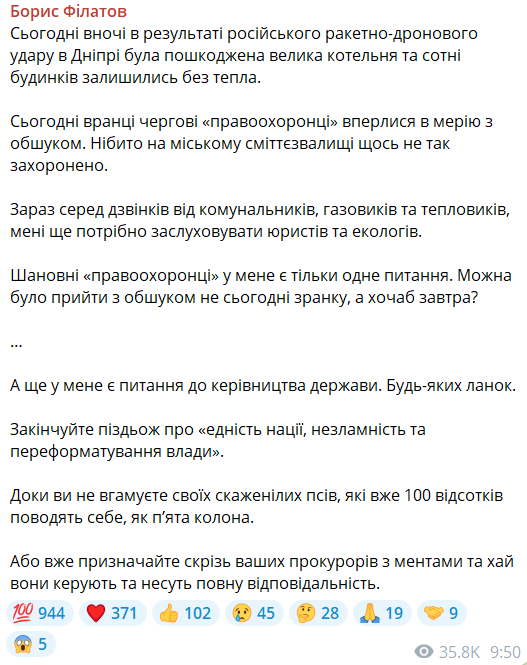 Борис Філатов наголосив, що обшуки відбуваються в день, коли місто ліквідовує наслідки ракетно-дронового удару: він заявив про пошкодження великої котельні та відсутність тепла в сотнях будинків.