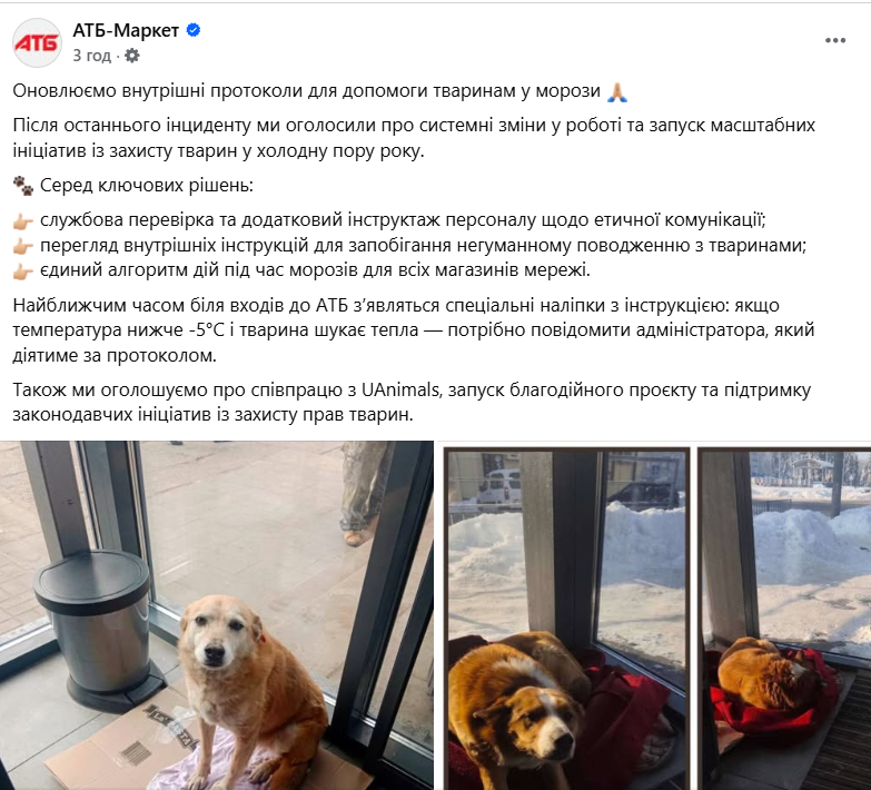 Найближчим часом, кажуть в АТБ, біля входів з’являться спеціальні наліпки з короткими правилами. Логіка така: якщо на вулиці нижче –5°C і тварина шукає тепла, відвідувачі мають повідомити адміністратора, а той діятиме за протоколом. Окремо мережа заявила про співпрацю з UAnimals, запуск благодійного проєкту та підтримку законодавчих ініціатив щодо захисту прав тварин.
