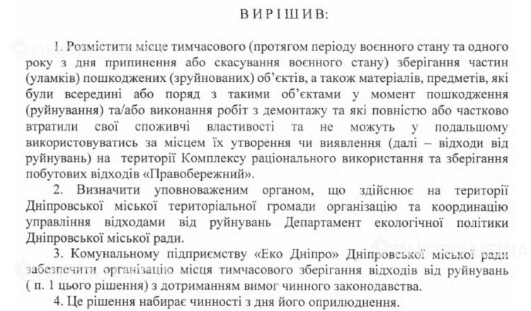 Після ворожих атак у містах накопичуються тонни будівельного сміття: уламки стін, плит, перекриттів, вибиті вікна, двері та інші матеріали, що більше не придатні до використання. У Дніпрі визначили спеціальний майданчик для тимчасового зберігання відходів від руйнувань. Його облаштують на території Комплексу раціонального використання та зберігання побутових відходів "Правобережний".