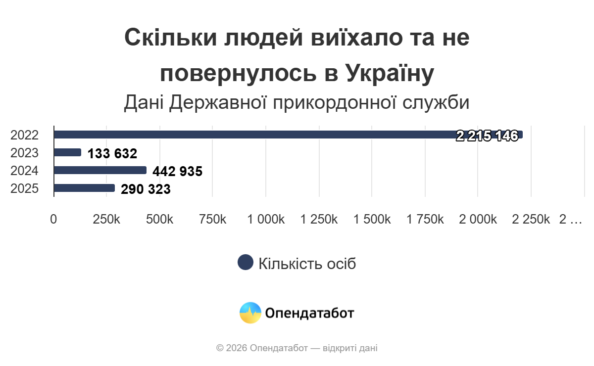 Сумарно за 4 роки 3,1 млн громадян офіційно поїхали з України і 72% з них зробили це в перший рік повномасштабного вторгнення.