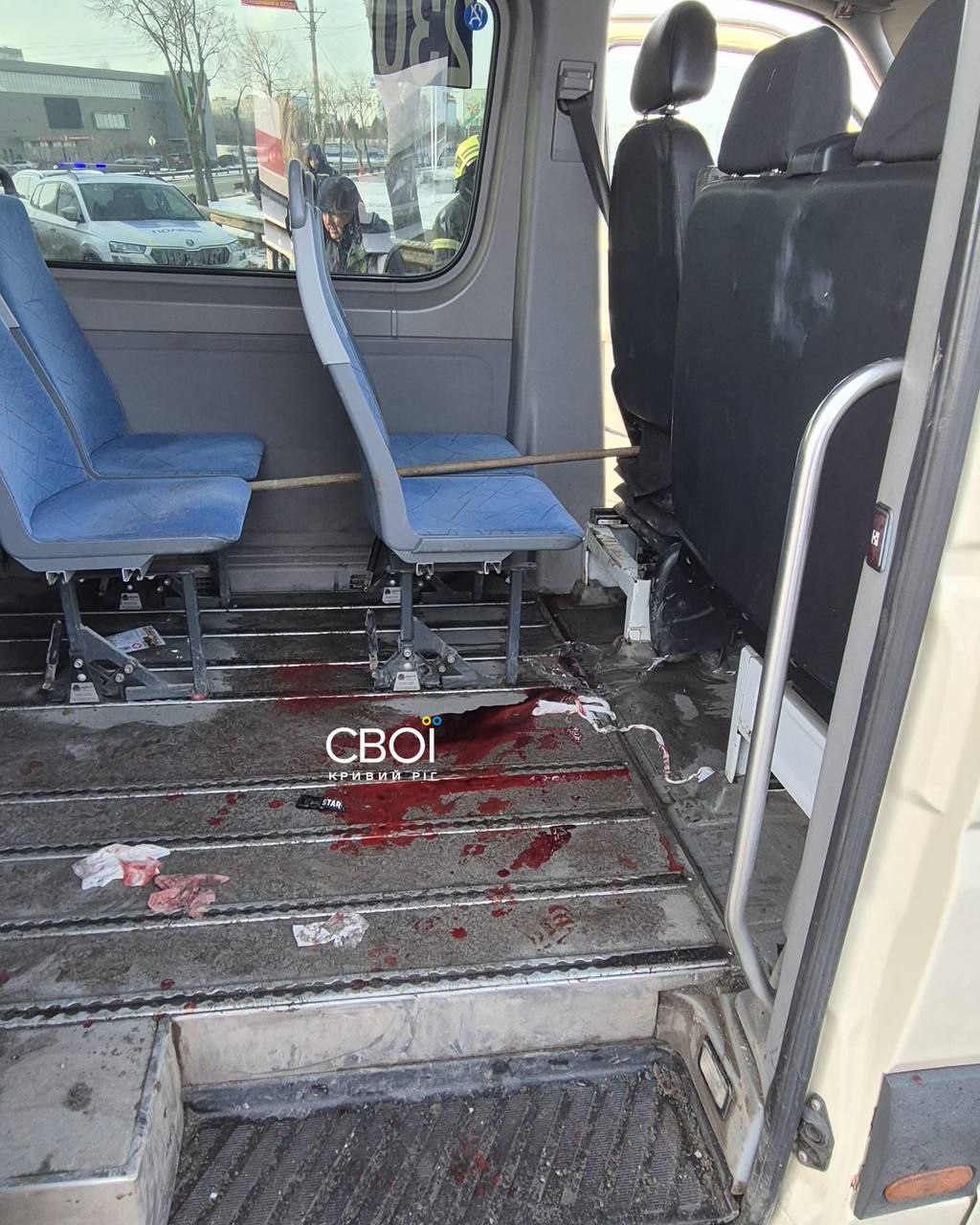 На підлозі салону маршрутки – кров. Одну з пасажирок маршрутки медики винесли на ношах, у неї турнікет на нозі.