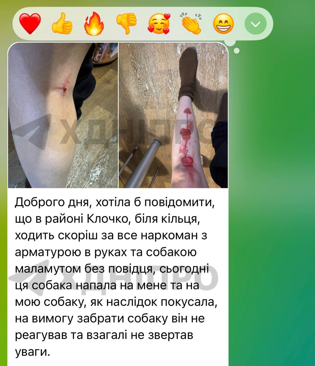 "Доброго дня, хотіла б повідомити, що в районі Клочко, біля кільця, ходить скоріш за все наркоман з арматурою в руках та собакою маламутом без повідця, сьогодні ця собака напала на мене та на мою собаку, як наслідок покусала, на вимогу забрати собаку він не реагував та взагалі не звертав уваги", — розповіла про ситуацію постраждала жінка.