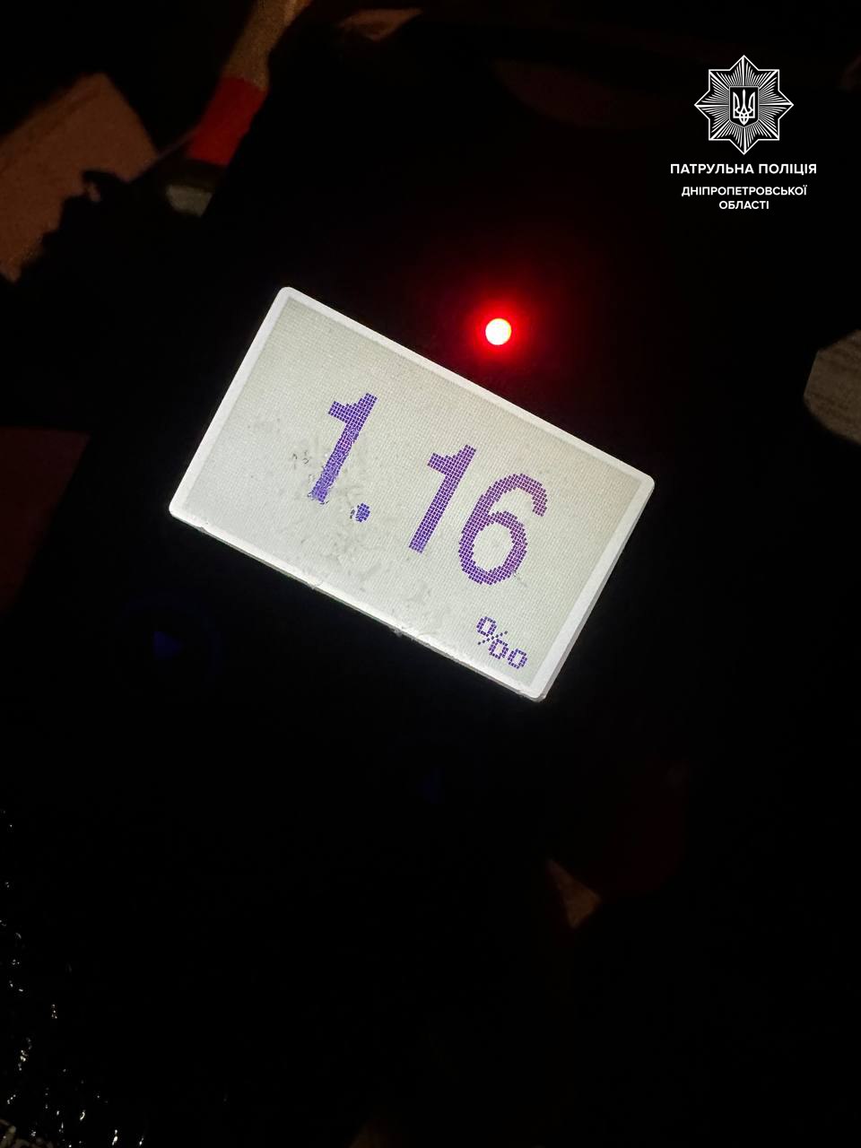 Днями в Амур-Нижньодніпровському районі під час комендантської години патрульні зупинили автомобіль Volkswagen. За словами інспекторів, водій мав ознаки алкогольного сп’яніння та погодився пройти освідування. Результат алкотестера - 1,16 проміле. На чоловіка склали протокол за ч.1 ст.130 КУпАП.